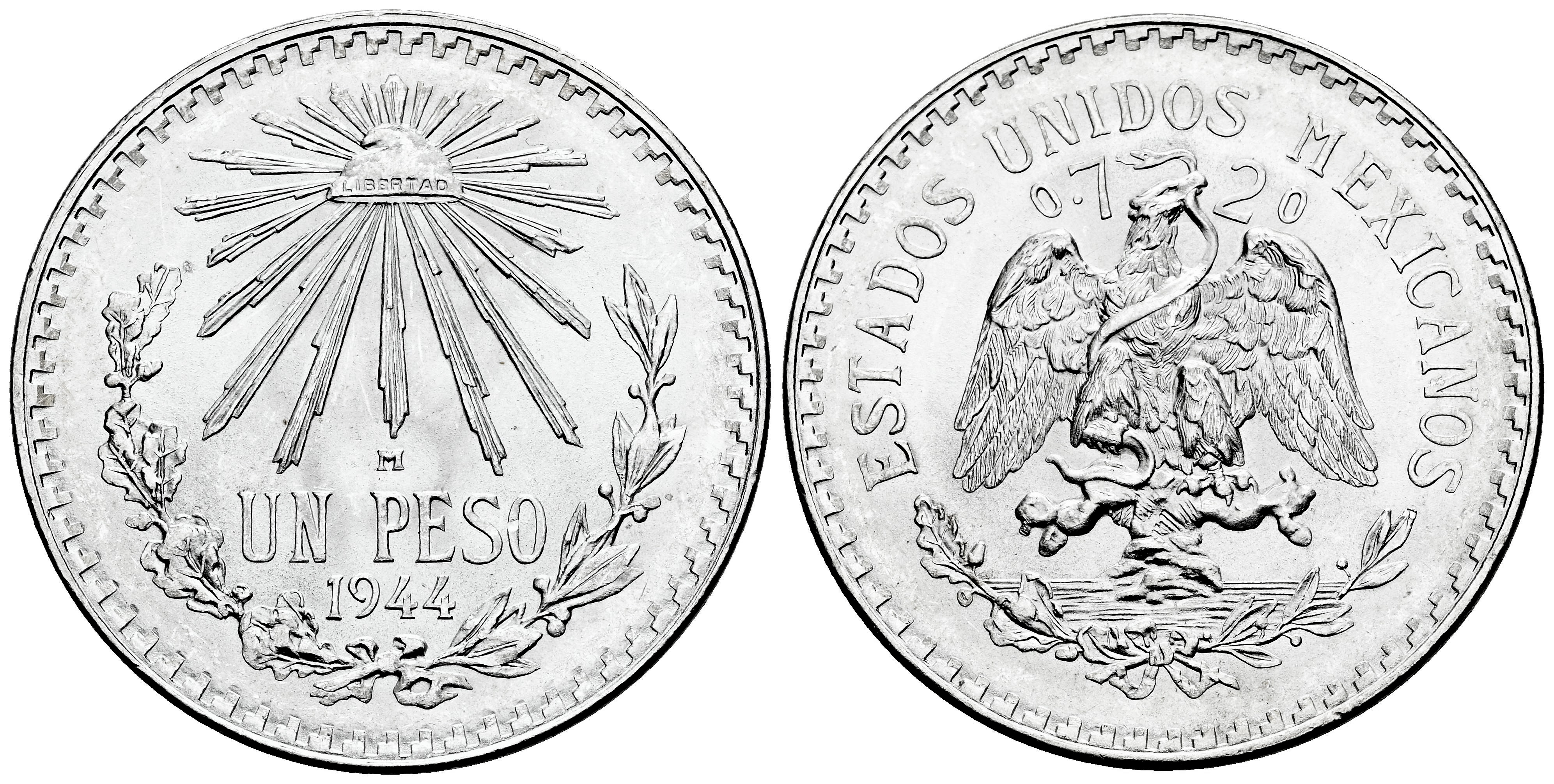 Mexico. 1 peso. 1944. Mexico. M. (Km-455). Ag. 16,73 g. Plenty of original luster. Mint state. Est...35,00.