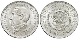Mexico. 5 pesos. 1957. Mexico. (Km-470). Ag. 18,01 g. 100th Anniversary of Constitution. Traces of luster. AU. Est...30,00.