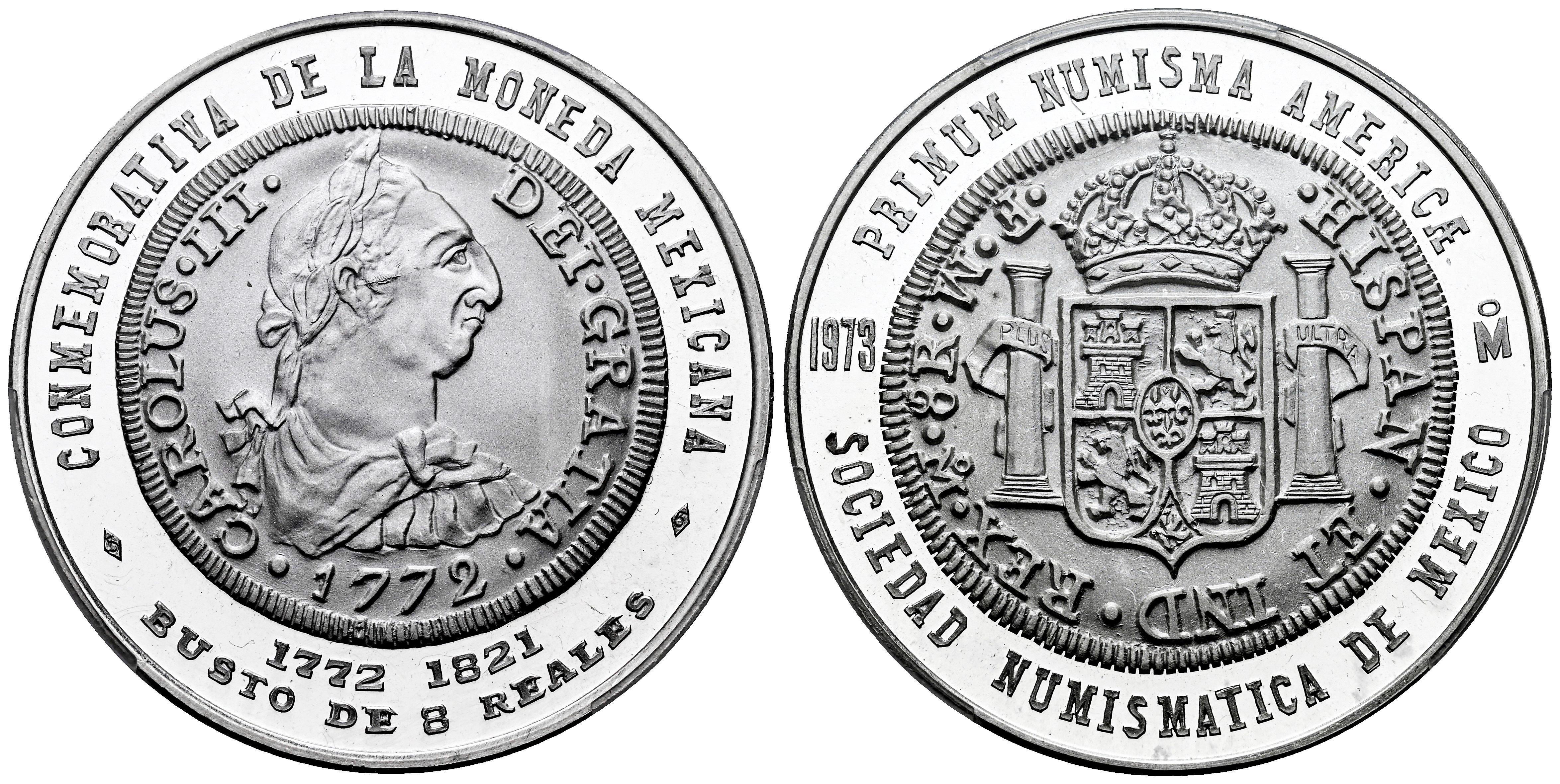 Mexico. Medal. 1973. Mexico Numismatic Society. Ag. Commemorative Series of Mexican Coinage, reproducing an 8 reales 1772 Mexico with inverted mintmark and assayers. Slabbed by PCGS as SP 69. Est...120,00.
