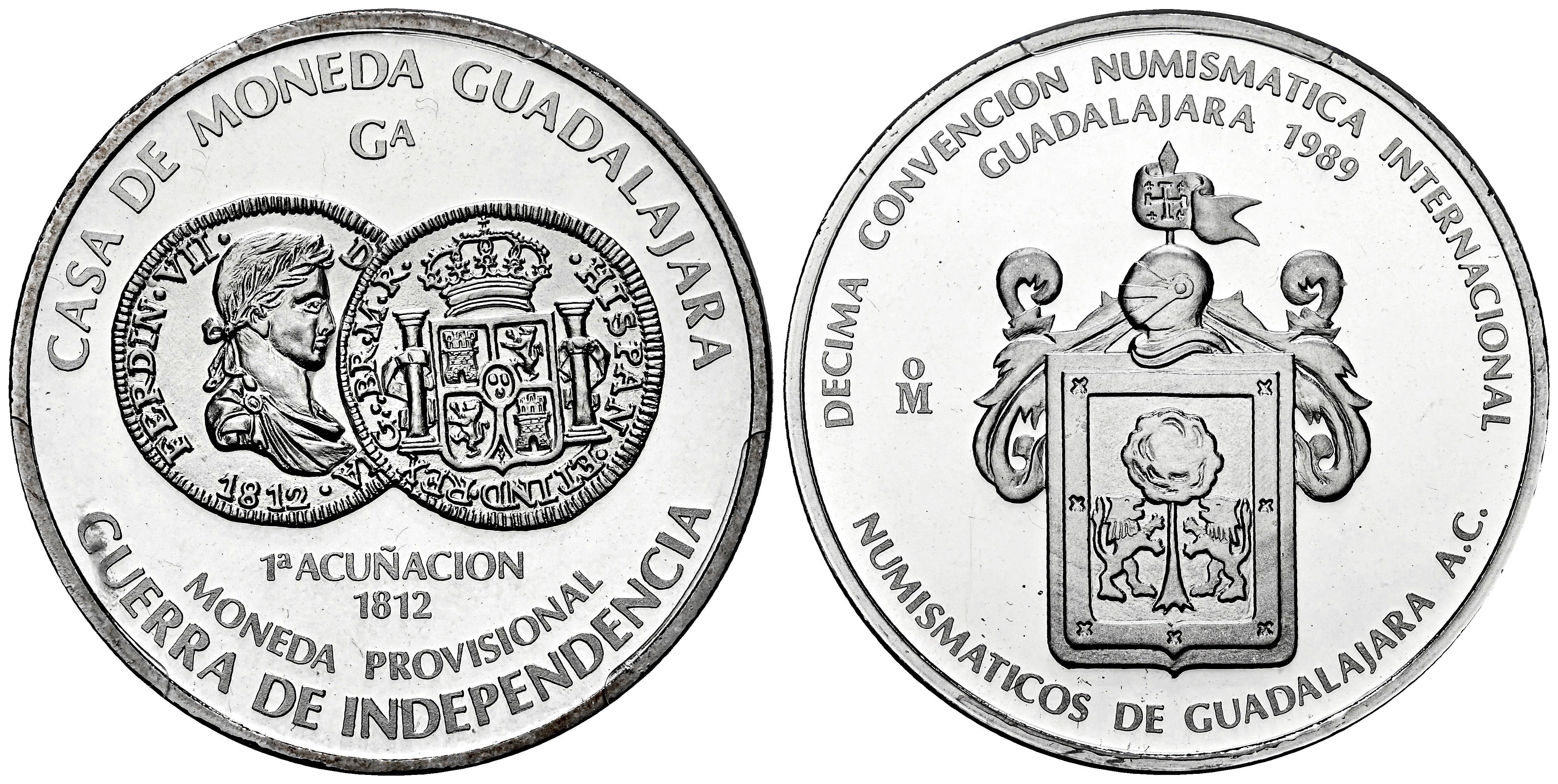Mexico. Medal. 1989. Mexico Numismatic Society. Ag. Commemorative Series of Mexican Coinage, reproducing an 1812 Guadalajara 8 reales, a provisional coin from the War of Independence. Tenth International Numismatic Convention of Guadalajara. Slabbed by PCGS as SP 68. Est...150,00.
