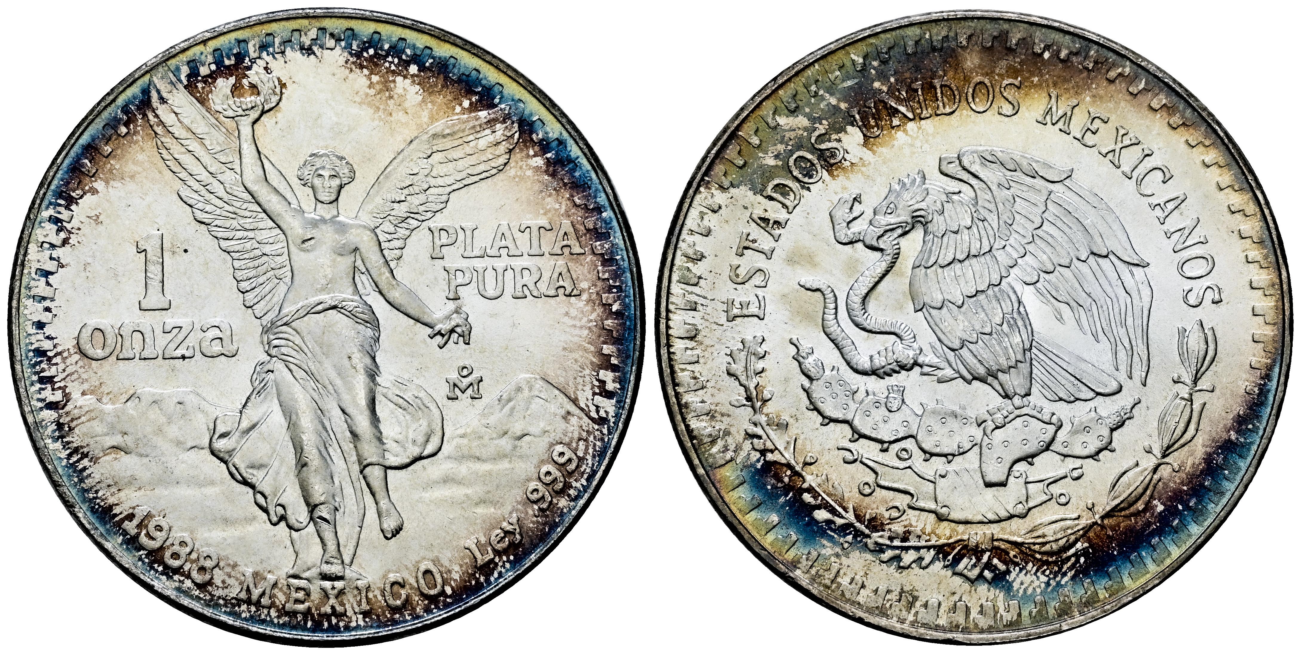 Mexico. 1 ounce. 1988. Mexico. (Km-494.1). Ag. 30,96 g. Beautiful slightly iridescent patina. Mint state. Est...60,00.