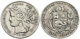 Peru. 5 pesetas. 1880. Lima. BF. (Km-201.2). Ag. 24,68 g. Cleaned. Nicks on edge. VF. Est...50,00.