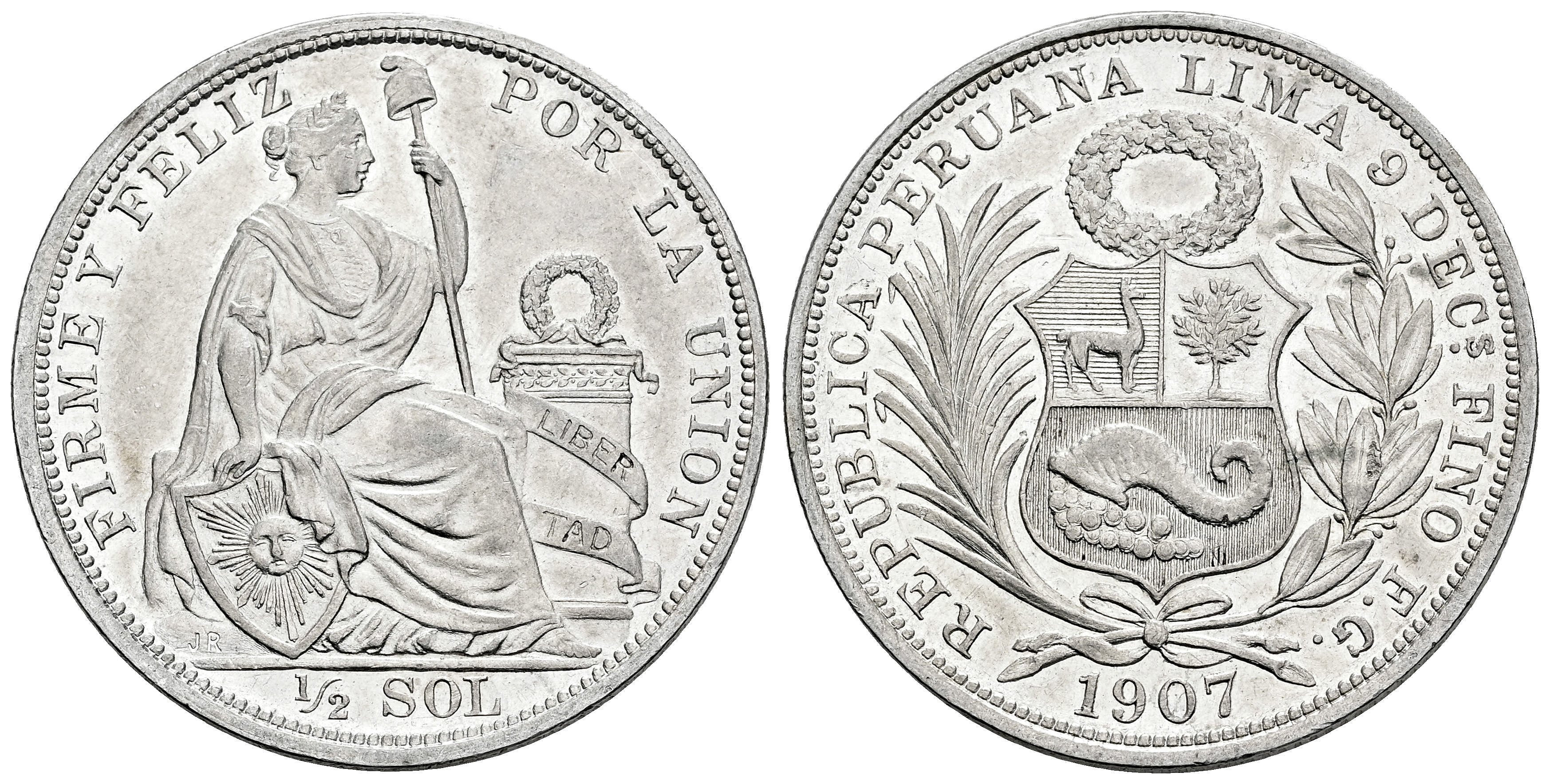 Peru. 1/2 sol. 1907. Lima. FG. (Km-203). Ag. 12,45 g. Original luster. Almost MS. Est...60,00.