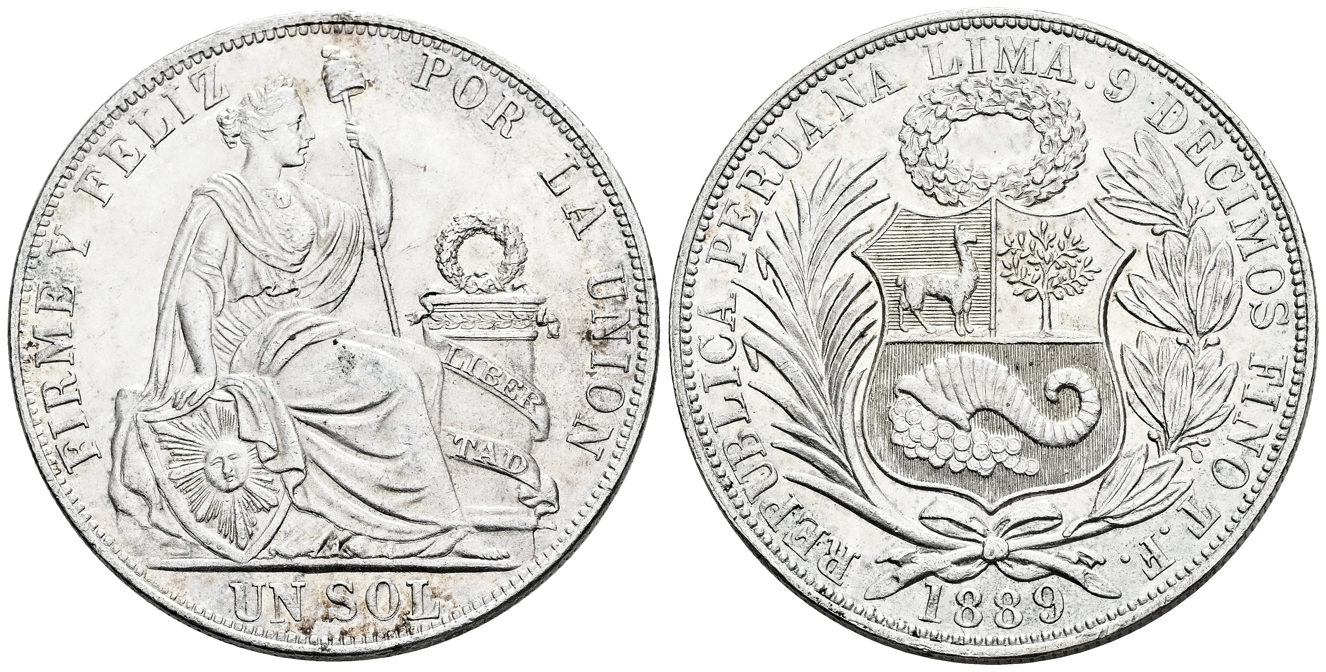 Peru. 1 sol. 1889. Lima. TF. (Km-196.24). Ag. 25,00 g. Original luster. Almost MS. Est...70,00.