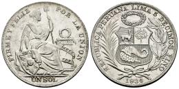 Peru. 1 sol. 1934. Lima. (Km-218.2). Ag. 25,05 g. Original luster. AU. Est...50,00.