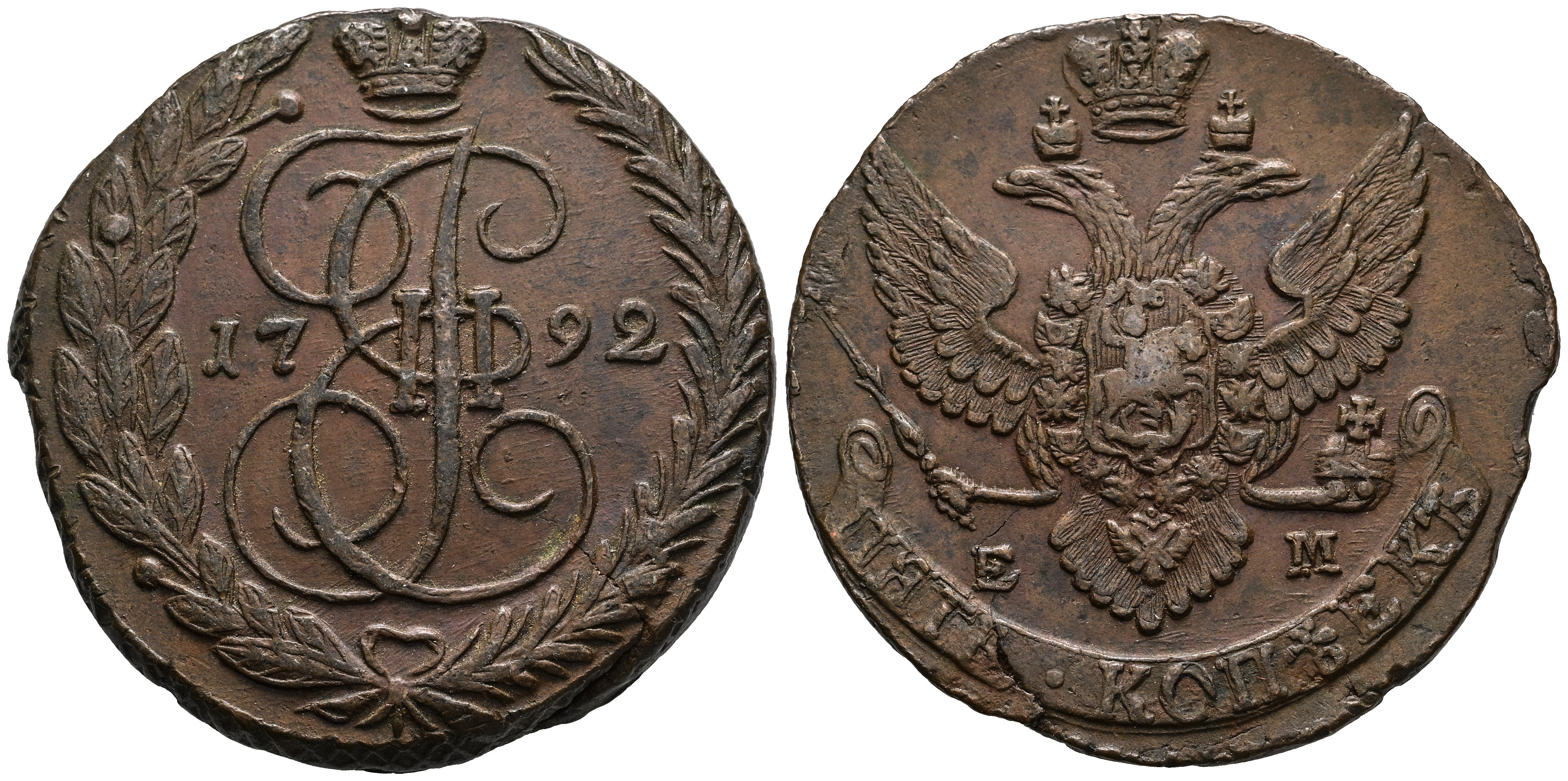 Russia. Catherine II (1762-1796). 5 kopecks. 1792. Ekaterinburg. EM. (Km-C59.3). (Bitkin-646). Ae. 52,57 g. Almost XF/Choice VF. Est...50,00.