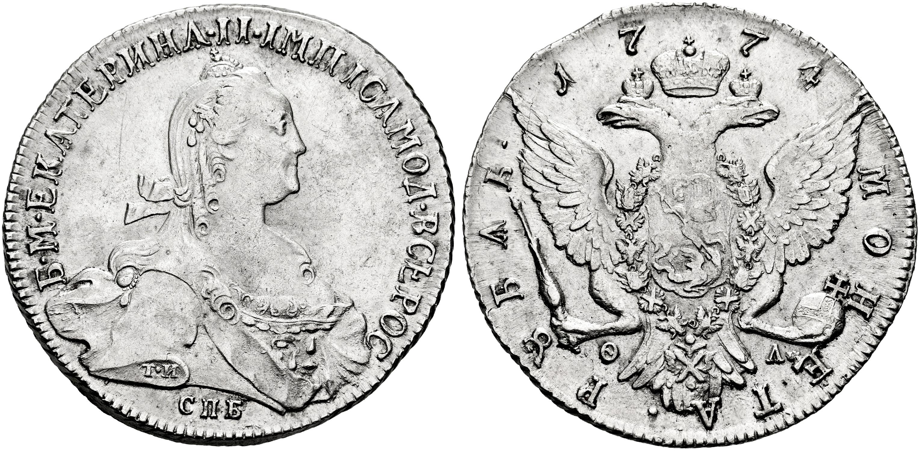 Russia. Catherine II (1762-1796). 1 rouble. 1775. Saint Petesburg. CПБ ФЛ. (Km-C#67a.2). (Bitkin-219). (Dav-1684). Ag. 23,54 g. Traces of luster. Almost XF/XF. Est...500,00.
