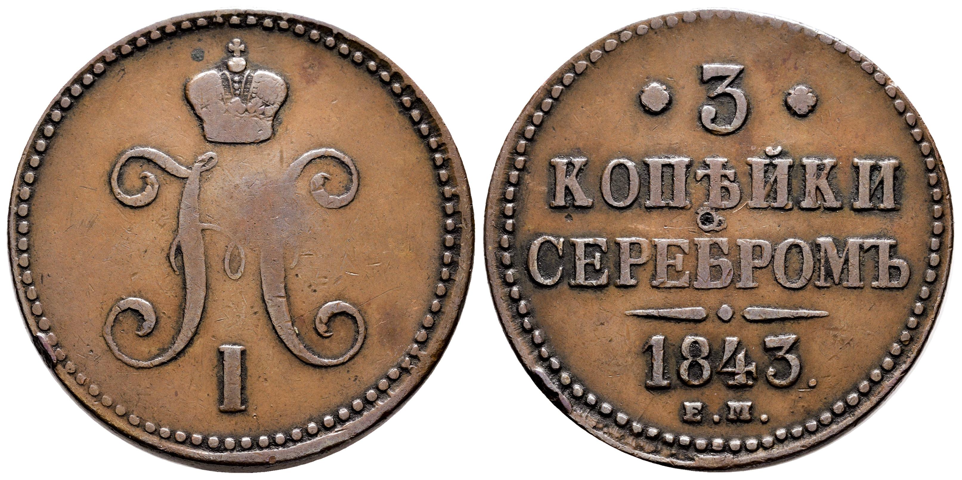 Russia. Nicholas I (1825-1855). 3 kopeks. 1843. Ekaterinburg. EM. (Km-146.1). (Bitkin-813). Ae. 29,13 g. Almost VF. Est...45,00.