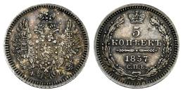 Russia. Alexander II (1855-1881). 5 kopecks. 1857. Saint Petesburg. СПБ-ФБ. (Bitkin-68). Ag. 1,02 g. Patina. Rare. XF. Est...100,00.