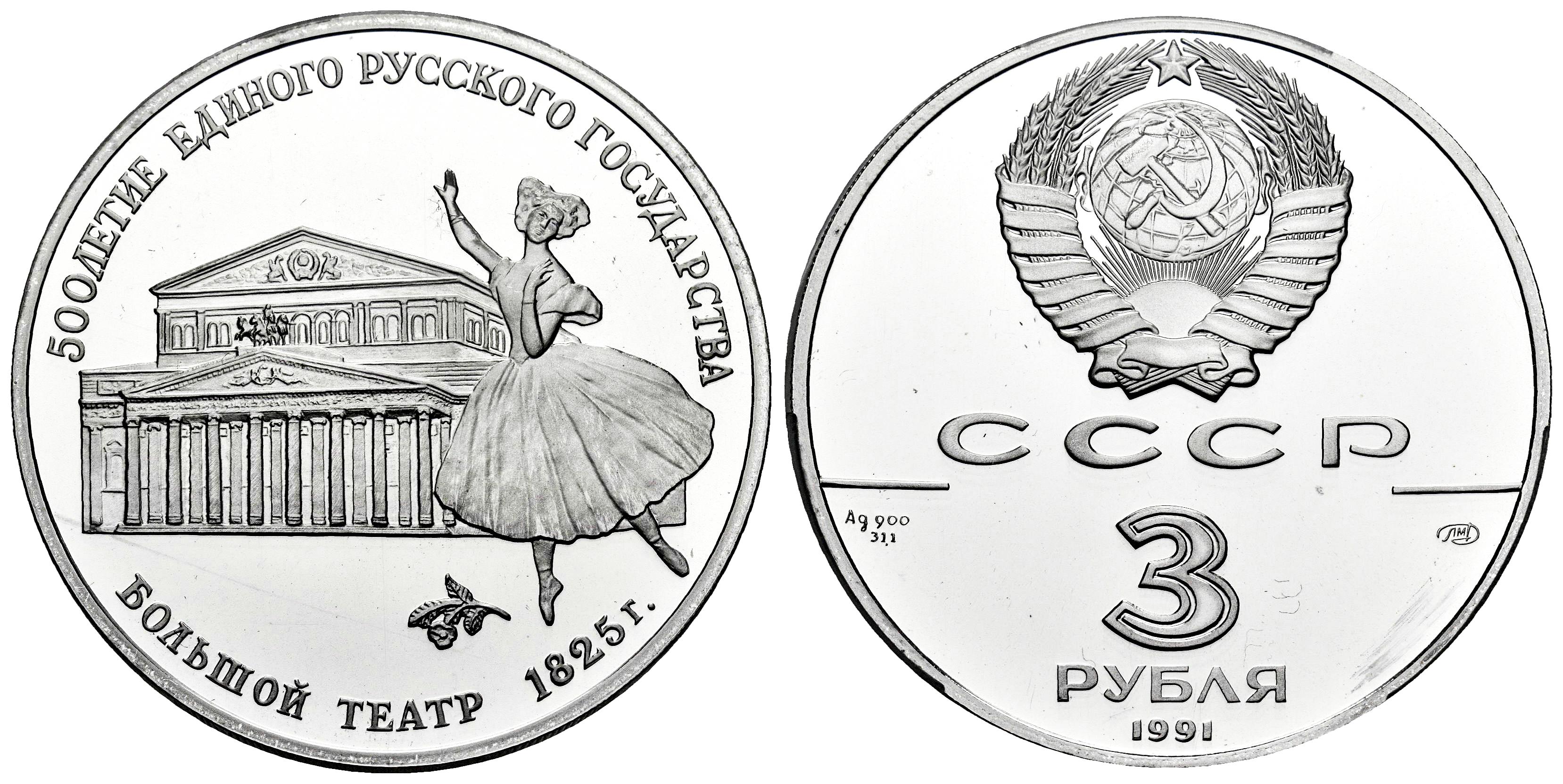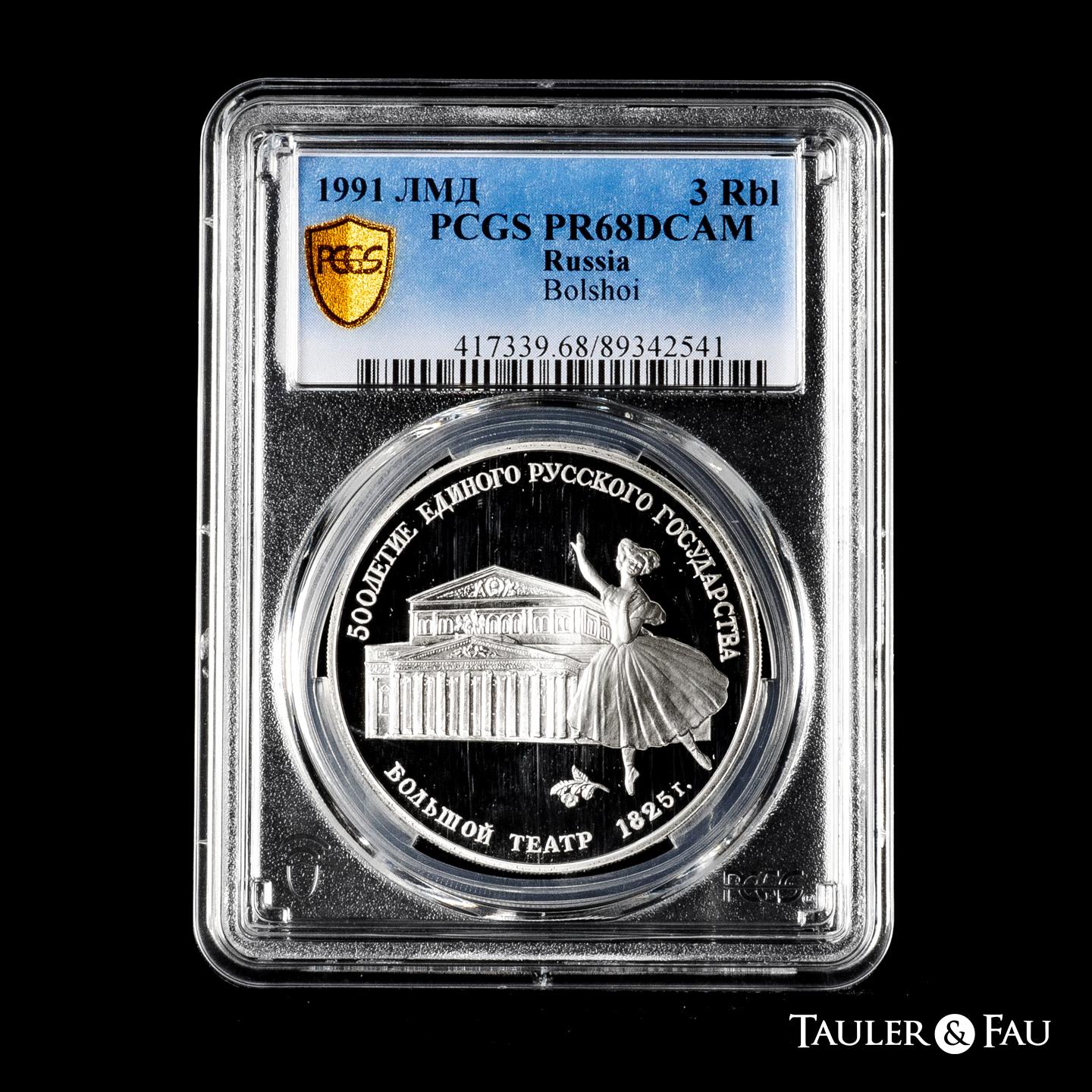 Russia. 3 roubles. 1991. Moscow. ММД. (Km-Y#274). Ag. Bolshoi Theatre. Slabbed by PCGS as PR 68 DCAM. Est...70,00.
