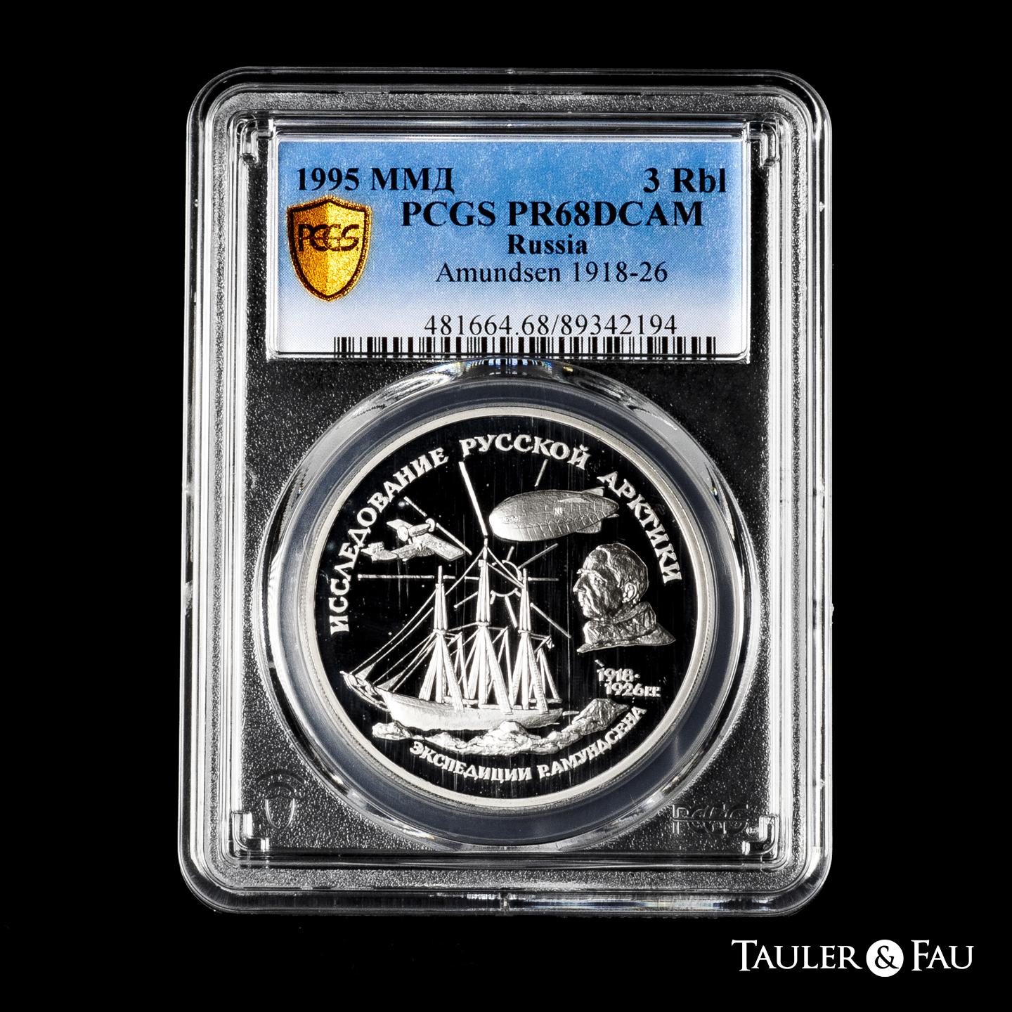 Russia. 3 roubles. 1995. Moscow. ММД. (Km-Y#462). Ag. Amundsen 1918-26. Slabbed by PCGS as PR 68 DCAM. Est...60,00.