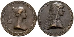 Austria. Maximilian. Medal. ND (1477). (Hill-831). Anv.: MAXIMILIANVS FR CAES F DVX - AVSTR BVRGVND. Rev.: MARIA KAROLI F DVX BVRGVNDIAE AVSTRIAE BRAB C FLAN. Ae. 28,08 g. Wedding of Maximilien and Maria di Borgogna. Puncture. By: G. Candida. 48 mm. VF. Est...300,00.