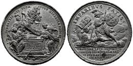 Archduke Charles of Austria. Medal. 1706. 170th anniversary of the victory of the House of Austria. (Van Loon-V, p. 27.11). (MHE-177 var.). Anv.: SVBMITTIT CVI TOTA SVOS HISPANIA FASCES - (CAROL·III·/HISPAN·REX/ARCH·AVSTR). Rev.: IMPARIBVS FATIS· / VISIONEMA·1536·POSTA·170/CAROLVS III·HISPANIAE REX·/ET DVX D·ANIOV DIVINO/FATO DIMPLENT/1706·. Pb. 25,39 g. Legend on edge: HVIC EGO NEC METAS RERVM NEC TEMPORA PONO . IMPERIVM SINE FINE DEDI. Engraver: F. Kleinert. 45 mm. Pewter. Slight oxidation typical of this metal. Very rare. Almost XF. Est...150,00.