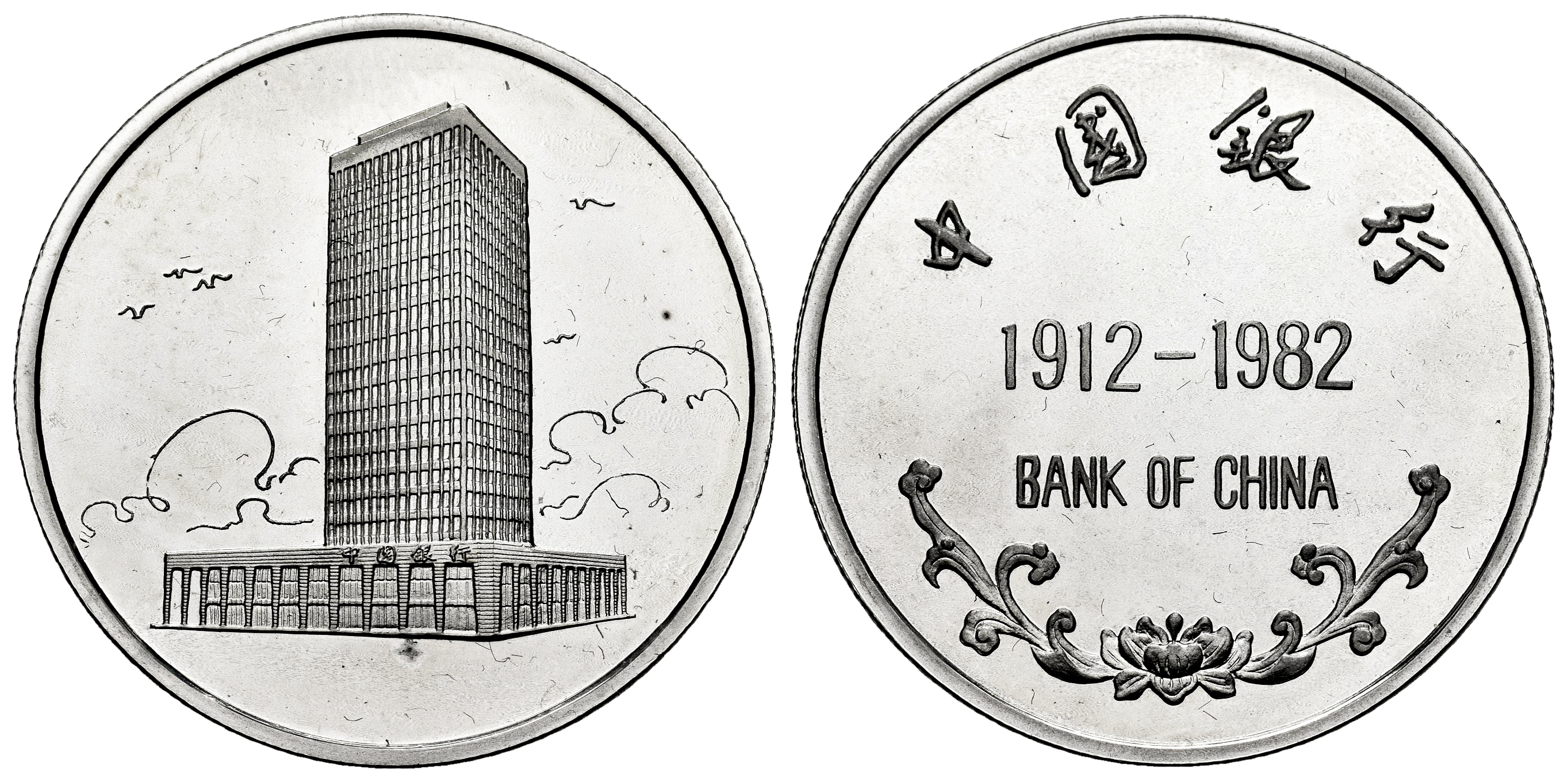 China. Medal. 1982. Ag. 15,54 g. Bank of China 1912-1982 / 70th Anniversary. Minimal lines on the reverse. PROOF. Est...60,00.
