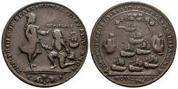 Great Britain. Vernon Admiral. Medal. 22 Noviembre 1739. (Adams&Chao-PBvl2B). Anv.: THE. PRIDE. OF. SPAIN. HUMBLED. BY. AD. VERNON. Admiral Vernon standing left receiving the sword of the defeated Admiral Blas de Lezo kneeling in front of him. Rev.: HE. TOOK. PORTO. BELLO. WITH. SIX. SHIPS. ONLY . Scene of the capture of Porto Bello with only six ships. Ae. 12,77 g. Scarce. VF. Est...250,00.