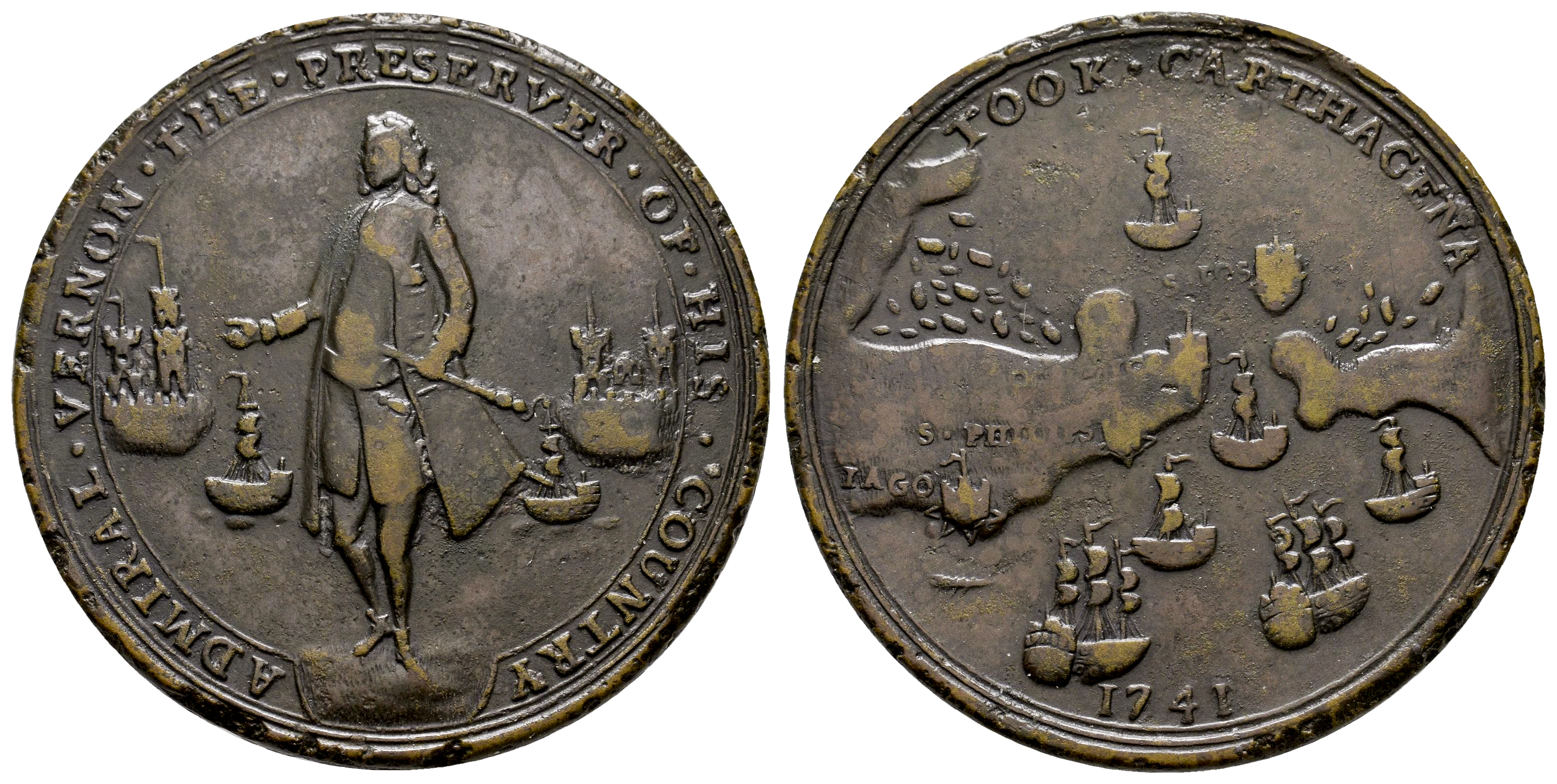 Great Britain. Vernon Admiral. Medal. 1741. Cartagena. (Adams&Chao-CAv2B). Anv.: ADMIRAL · VERNON · THE · PRESERVER · OF · HIS · COUNTRY. Full-length figure of Vernon standing with ships in the harbor. Rev.: TOOK · CARTHAGENA - 1741. Ships sailing into the harbor of Carthagena and passing the forts of IAGO, S.PHILIPS, BOCACHICA, and S. IOS. Ae. 19,02 g. Rare. Ex colecttion Jhon. W. Adams. Almost VF. Est...180,00.