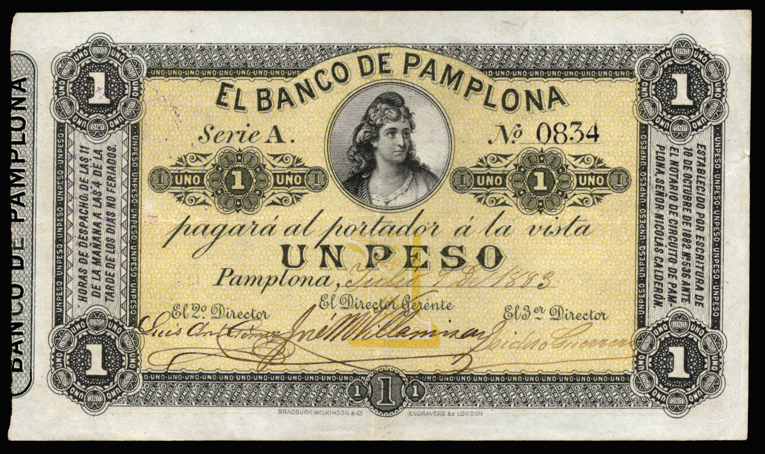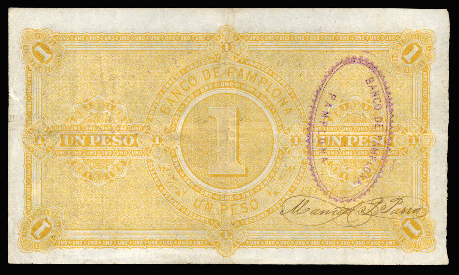 Colombia. 1 peso. 1883. Banco de Pamplona. (Pick-S711B). 9 de julio. Serie A. Doblez vertical, horizontal y esquinas roma. Sello en tinta morada en reverso. VF. Est...200,00.