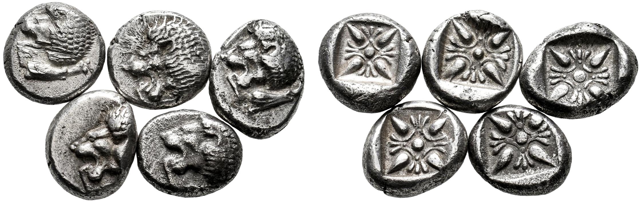 Lot of 5 coins from Ancient Greece. 1/12 Stater from Ionia, Miletus. 520-450 BC (SNG Kayhan-476/81). (SNG Keckman-273). Ar. It is essential a rigorous examination of the lot. ONLY SHIPPING TO SPAIN PENINSULA. NO RETURNS ALLOWED. VF/Choice VF. Est...220,00.