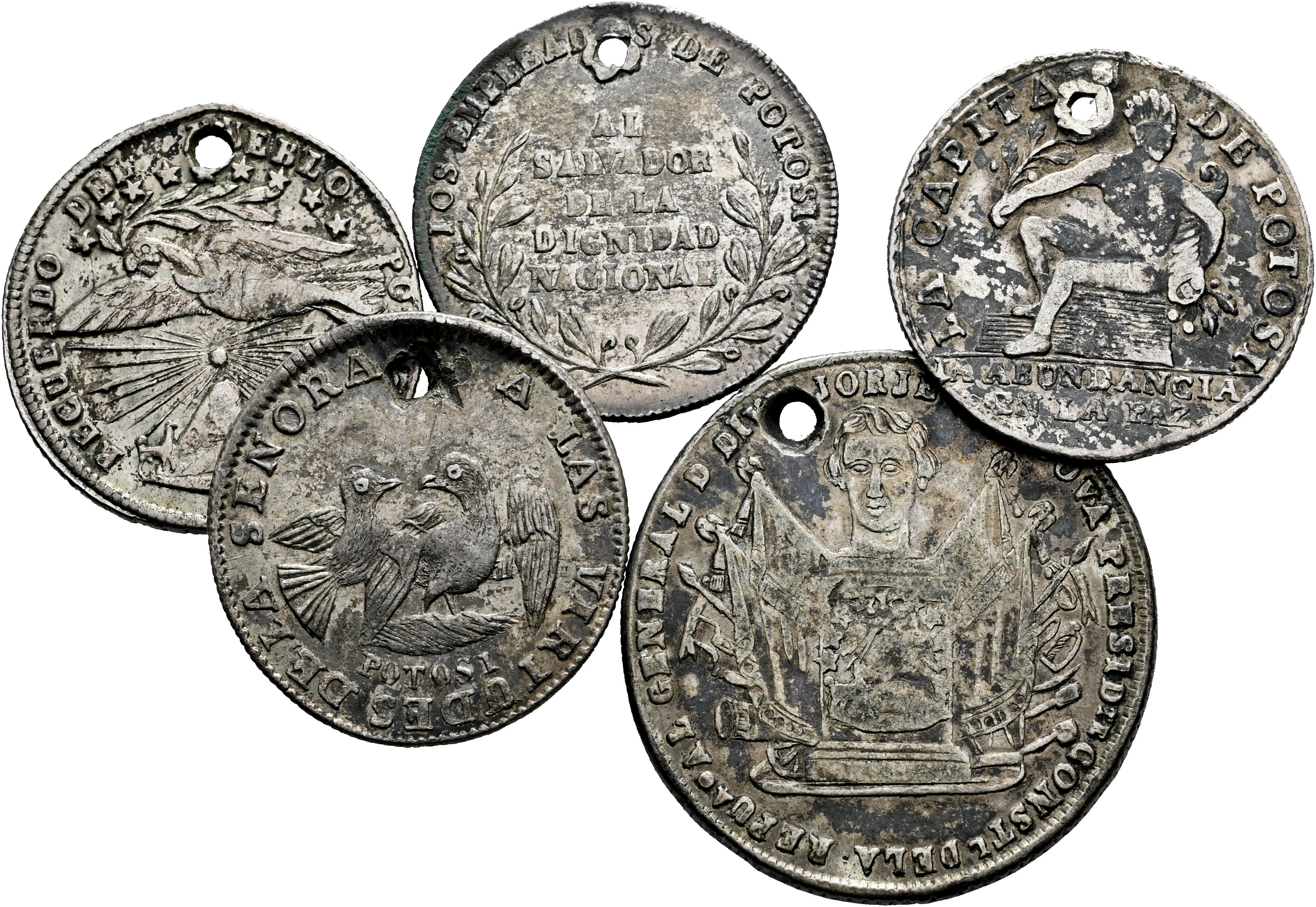 Lot of 5 medals of Bolivian. All with hole. It is essential a rigorous examination of the lot. ONLY SHIPPING TO SPAIN PENINSULA. NO RETURNS ALLOWED. Choice F/Almost VF. Est...100,00.