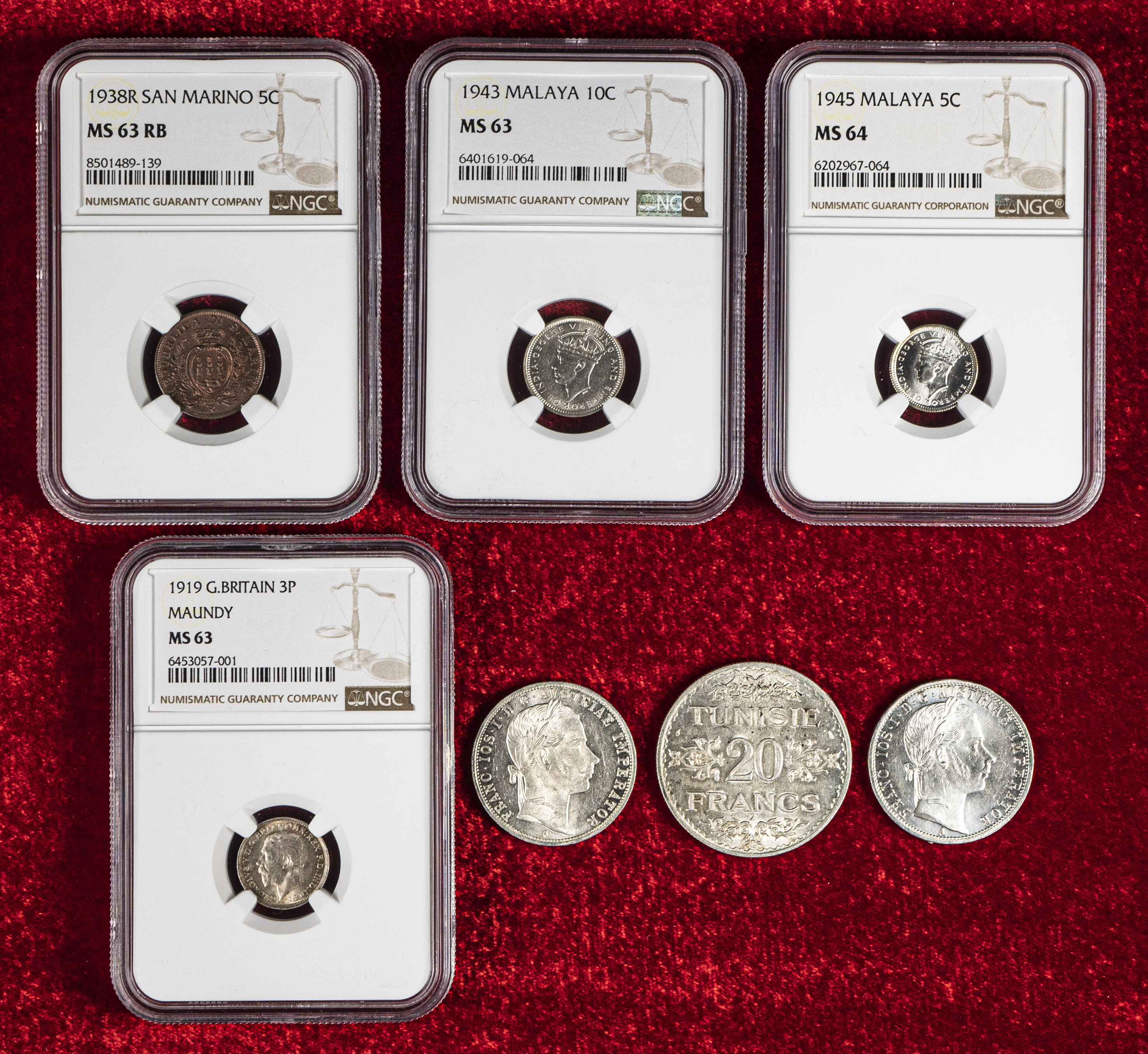 Lot of 7 foreign coins: San Marino 5 centesimi 1938 MS 63 RB, Malaya 10 cents 1943 MS 63, Malaya 5 cents 1945 MS 64, Great Britain 3 pounds 1919 MS 63, Austria 1 florin 1860, Austria 1 florin 1861, and Tunisia 20 francs. It is essential a rigorous examination of the lot. ONLY SHIPPING TO SPAIN PENINSULA. NO RETURNS ALLOWED. Est...150,00.