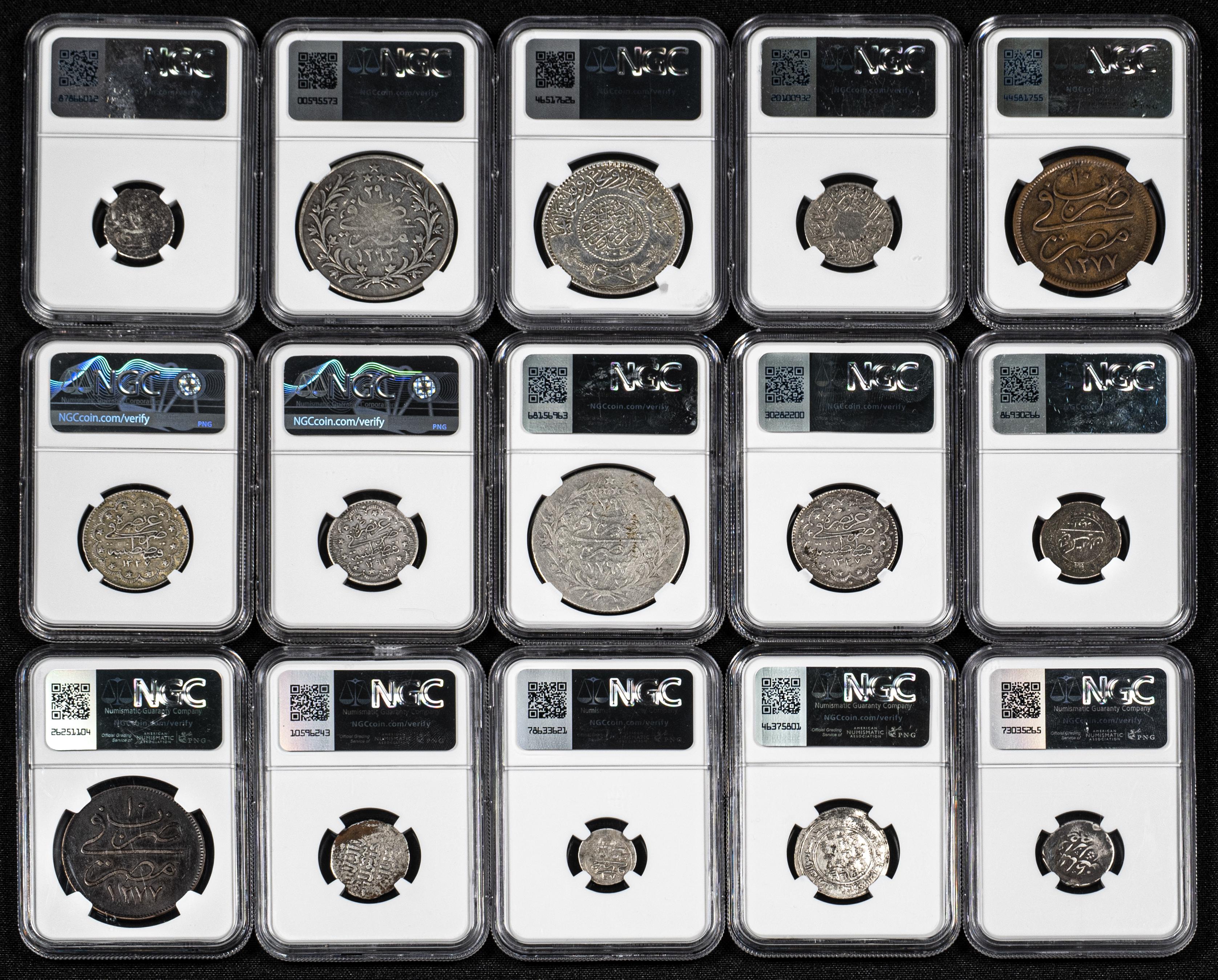 Lot of 15 different world coins, all slabbed by NGC: Turkey, Ottoman Empire, Egypt, and Iran, in various grades, though the great majority are with Details. It is essential a rigorous examination of the lot. ONLY SHIPPING TO SPAIN PENINSULA. NO RETURNS ALLOWED. Est...500,00.
