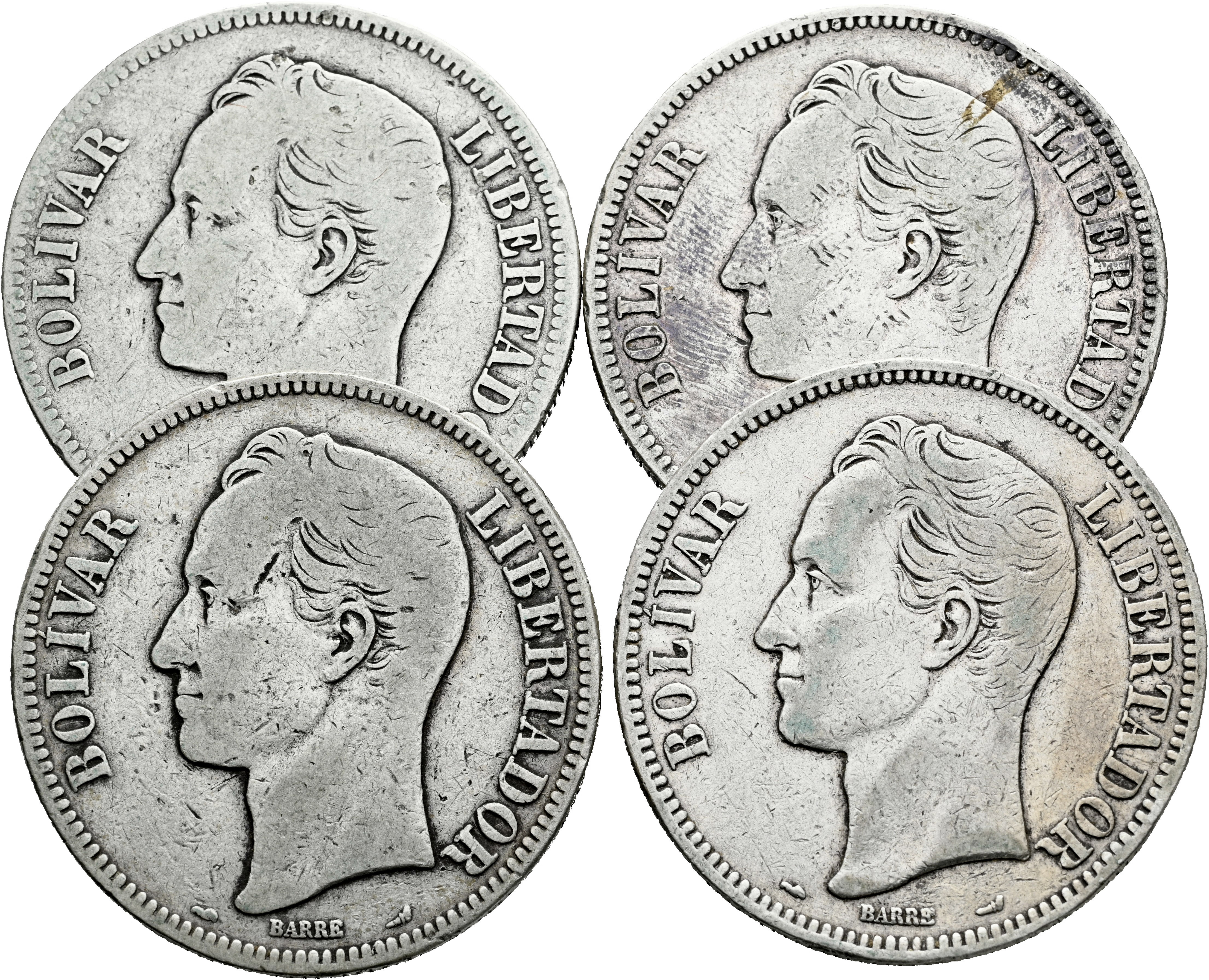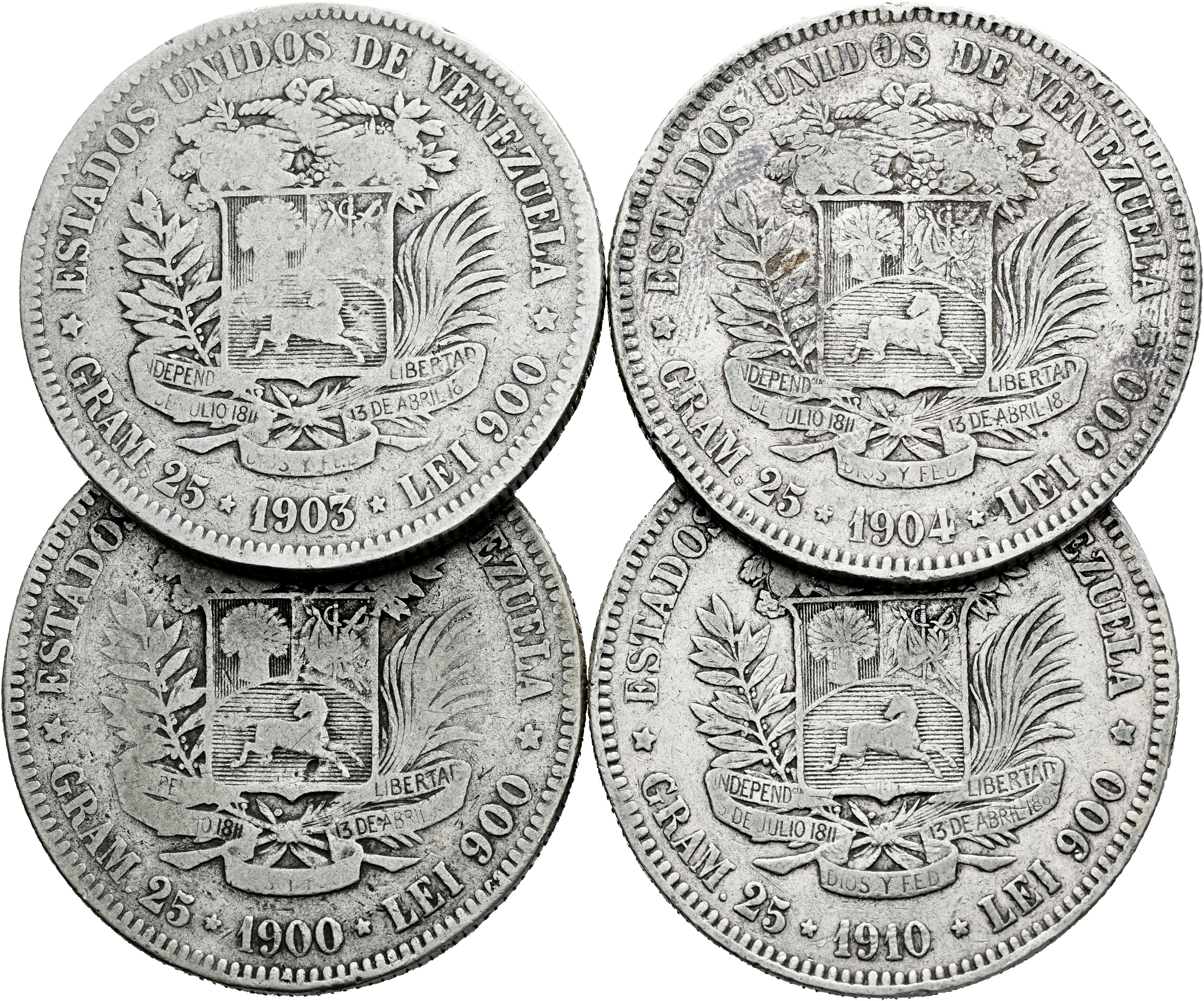 Lot of 4 coins of Venezuela 5 bolivares; 1900, 1903, 1904 y 1910. It is essential a rigorous examination of the lot. ONLY SHIPPING TO SPAIN PENINSULA. NO RETURNS ALLOWED. F/Choice F. Est...90,00.