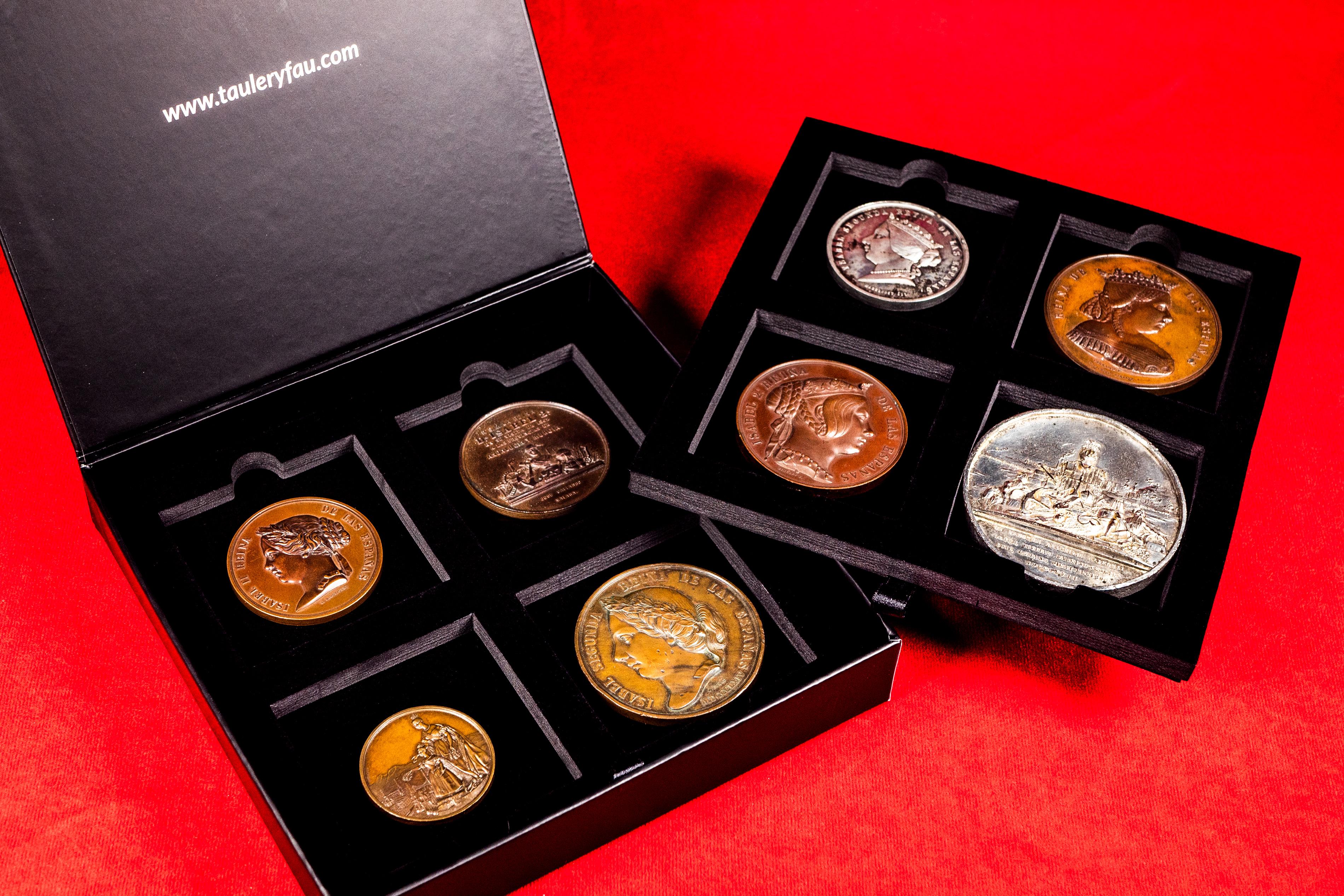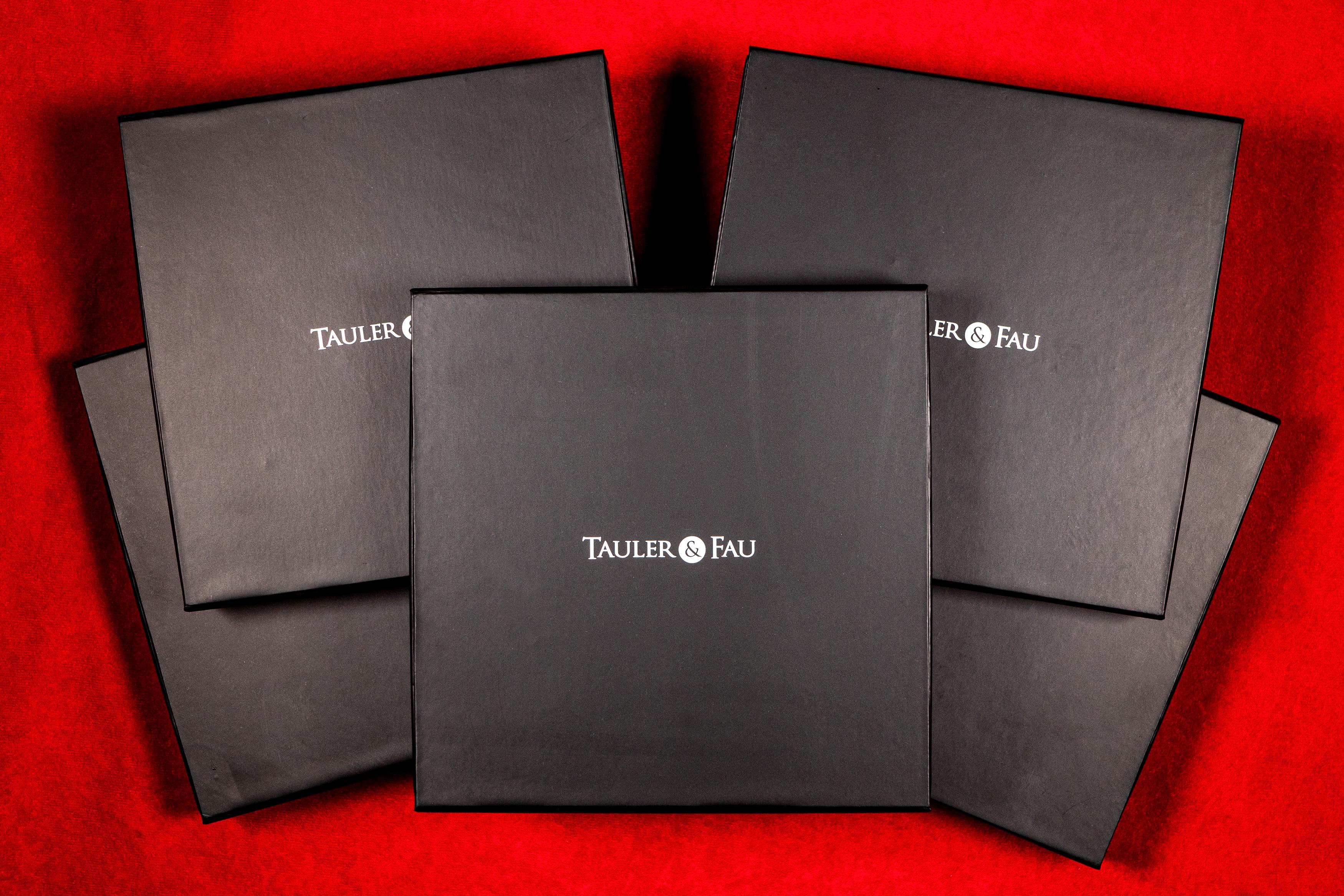 Lot of 5 elegant large corporate coin cases by Tauler&Fau; external measurements 190x193x36 mm, made of sturdy black cardboard. Each case contains 2 trays with 4 slots of 70x70 mm. SHIPPING ONLY TO SPAIN. NO RETURNS. Est...50,00.