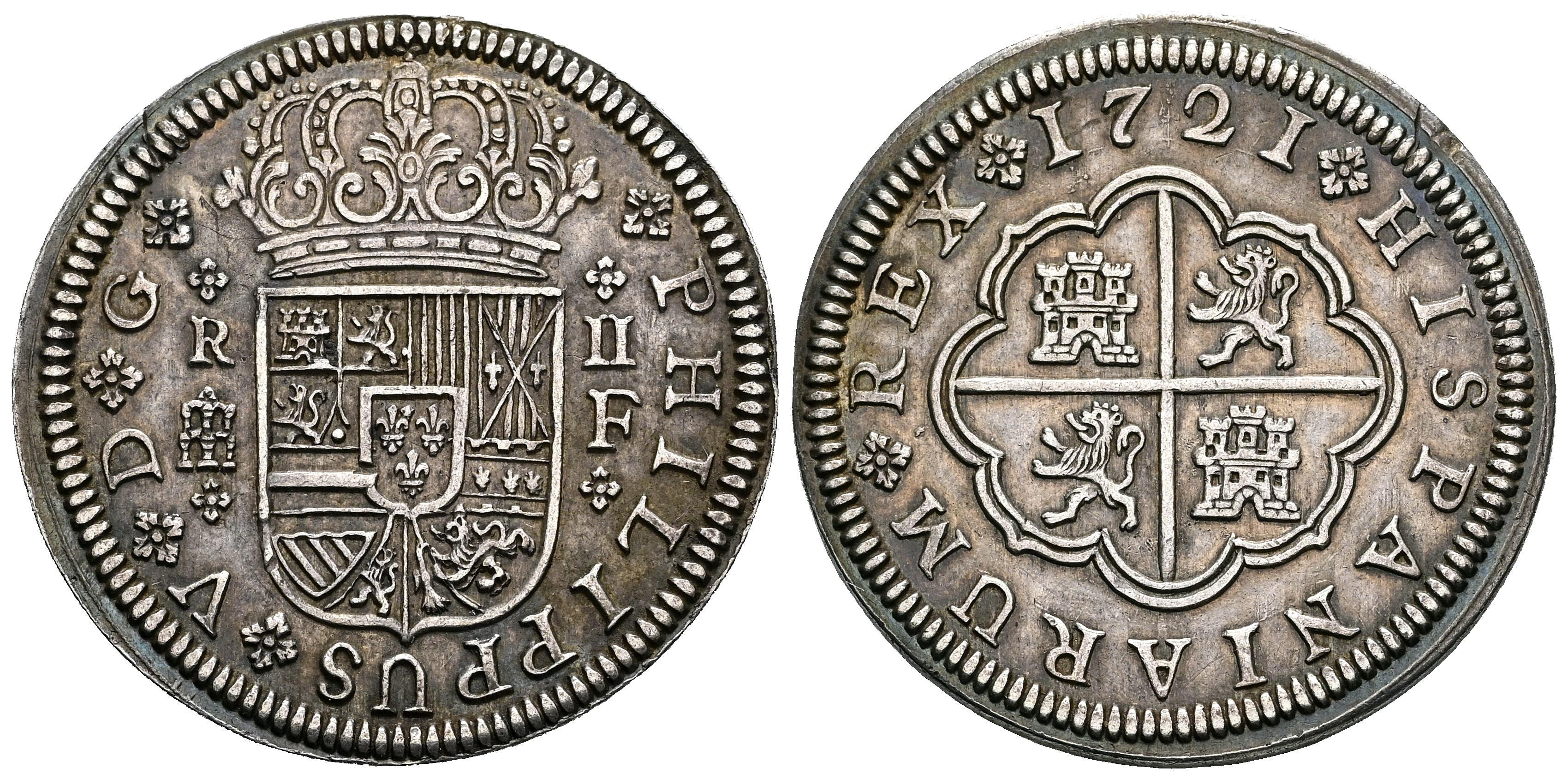 Philip V (1700-1746). 2 reales. 1721. Segovia. F. (Cal-954). Ag. 5,72 g. Beautiful patina. XF. Est...200,00.