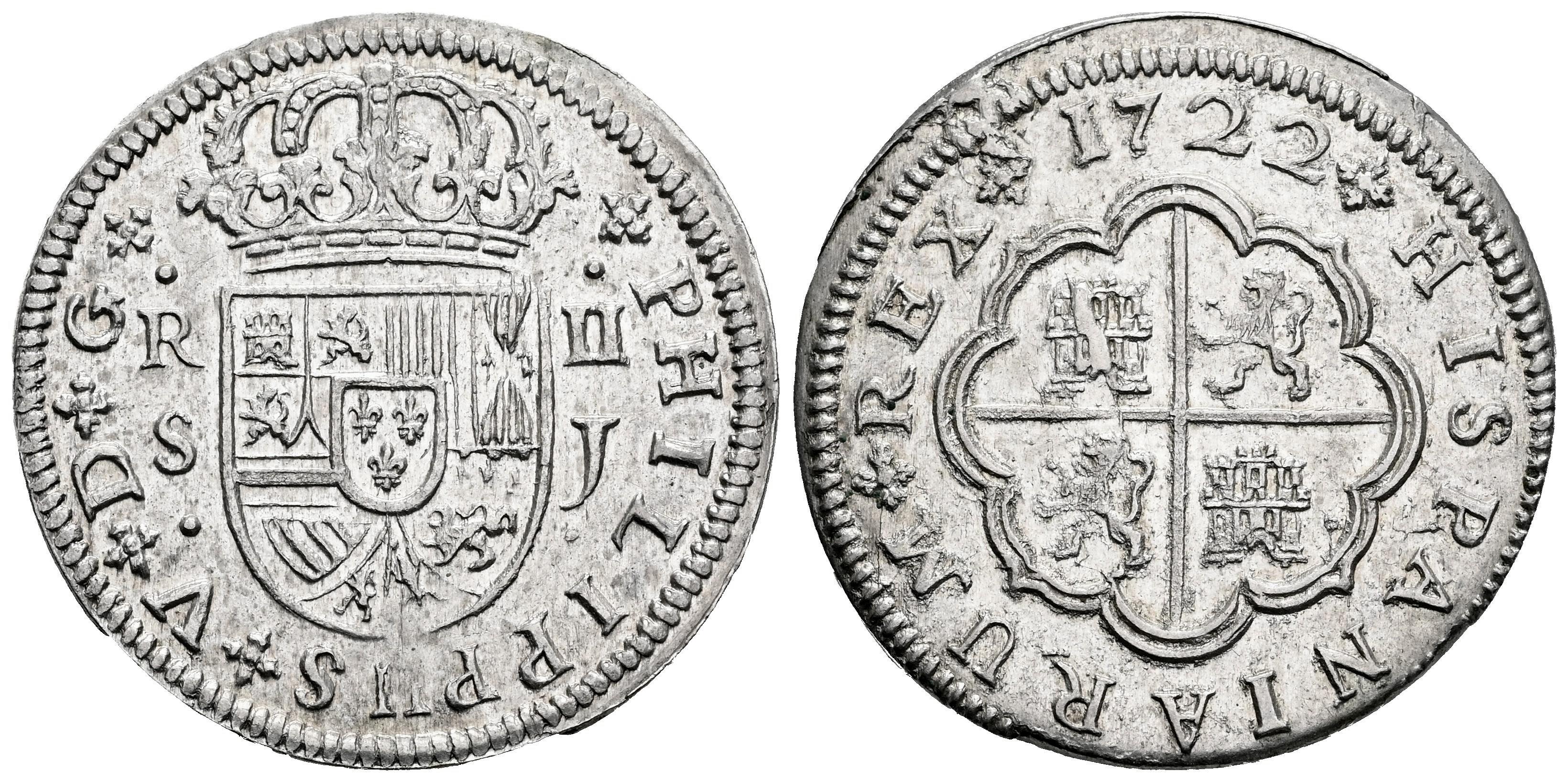 Philip V (1700-1746). 2 reales. 1722. Sevilla. J. (Cal-980). Ag. 5,67 g. Original luster. Scarce in this grade. AU/XF. Est...180,00.