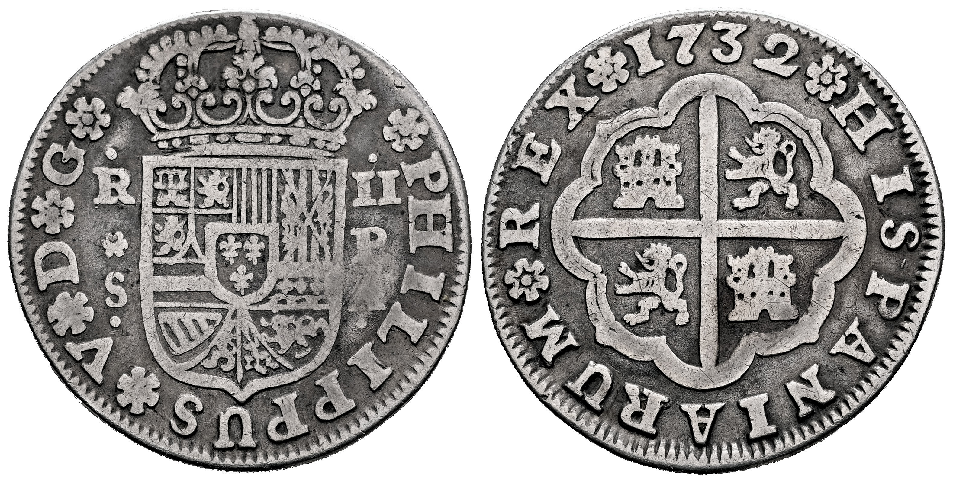 Philip V (1700-1746). 2 reales. 1732. Sevilla. PA. (Cal-988). Ag. 5,20 g. Choice F. Est...30,00.