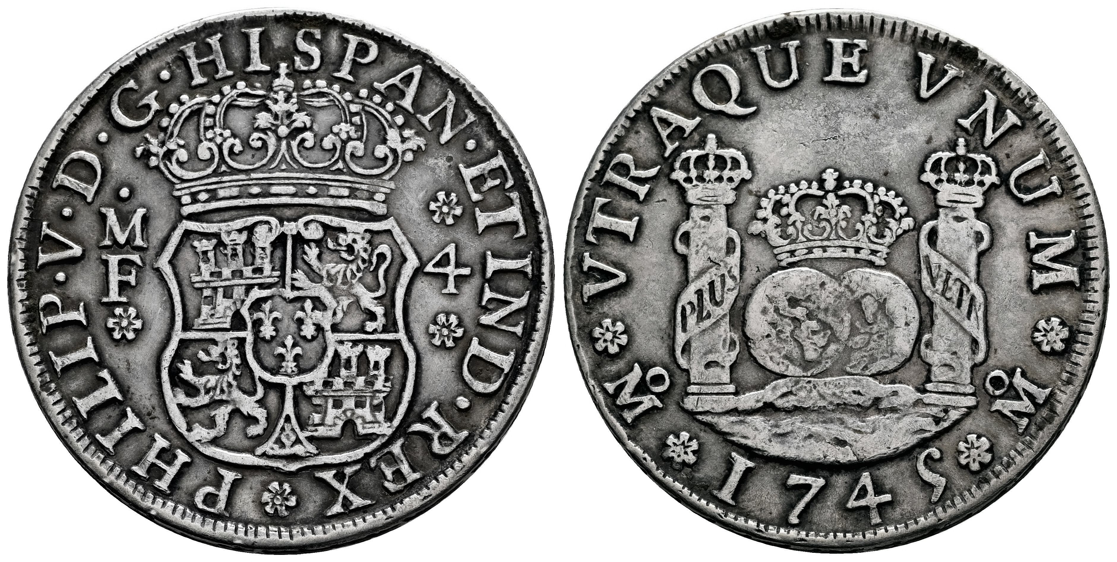 Philip V (1700-1746). 4 reales. 1745. Mexico. MF. (Cal-1132). Ag. 13,31 g. Faint scratches. Rust on edge. Scarce. Choice VF/VF. Est...250,00.