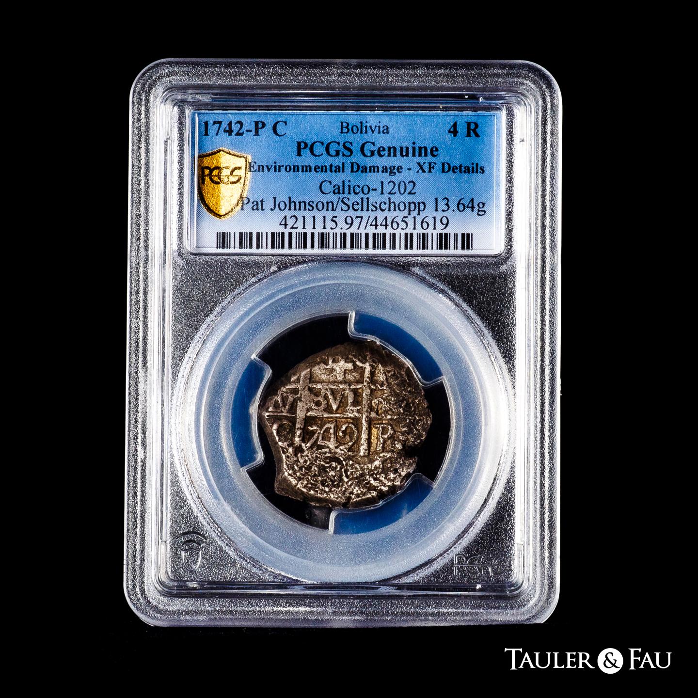 Philip V (1700-1746). 4 reales. 1742. Potosi. C. (Cal-1202). Ag. 13,64 g. Double date. Ex Pat Johnson Collection, Stack's & Bowers Galleries (14/11/2022), lot 71221. Slabbed by PCGS as Genuine. Environmental Damage - XF Details. PCGS-XF. Est...250,00.