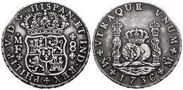 Philip V (1700-1746). 8 reales. 1736. Mexico. MF. (Cal-1445). Ag. 26,69 g. Slight patina. Planchet defect on edge. VF. Est...400,00.