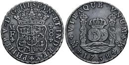Philip V (1700-1746). 8 reales. 1738. Mexico. MF. (Cal-1449). Ag. 26,71 g. Minor scuffing and scratches. Lightly toned. VF. Est...300,00.