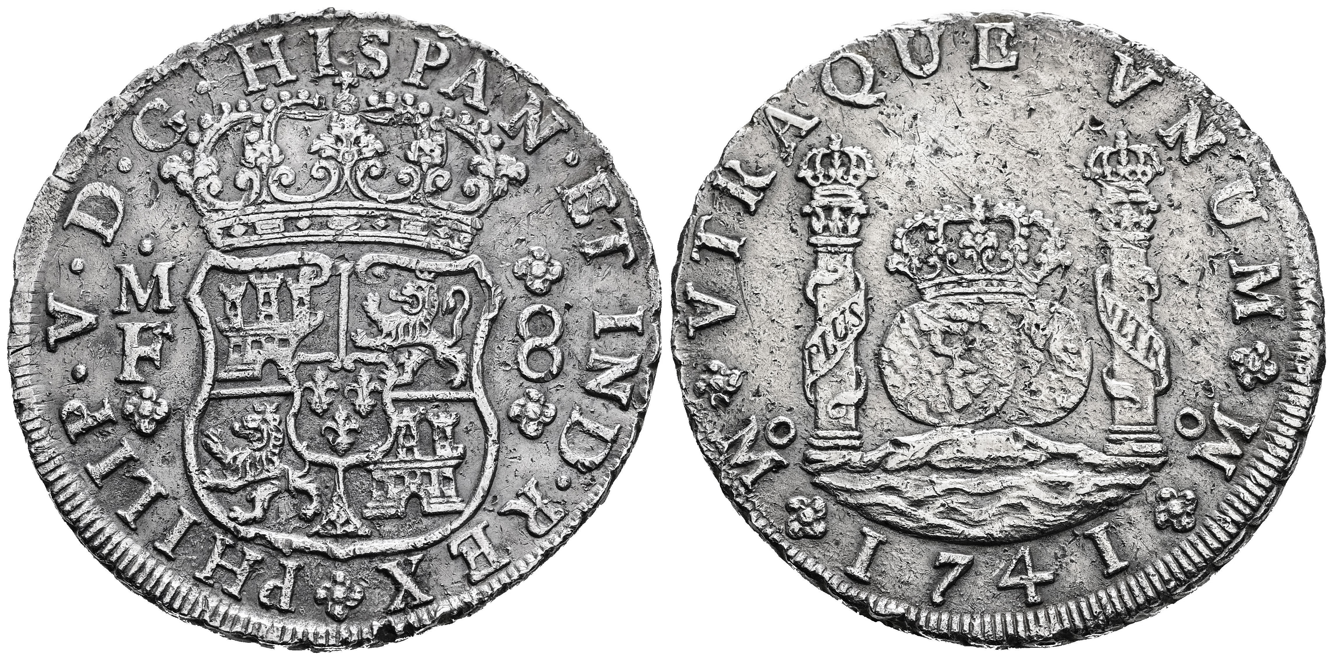 Philip V (1700-1746). 8 reales. 1741. Mexico. MF. (Cal-1458). Ag. 26,66 g. Knocks. Wavy flan. VF/Almost VF. Est...300,00.