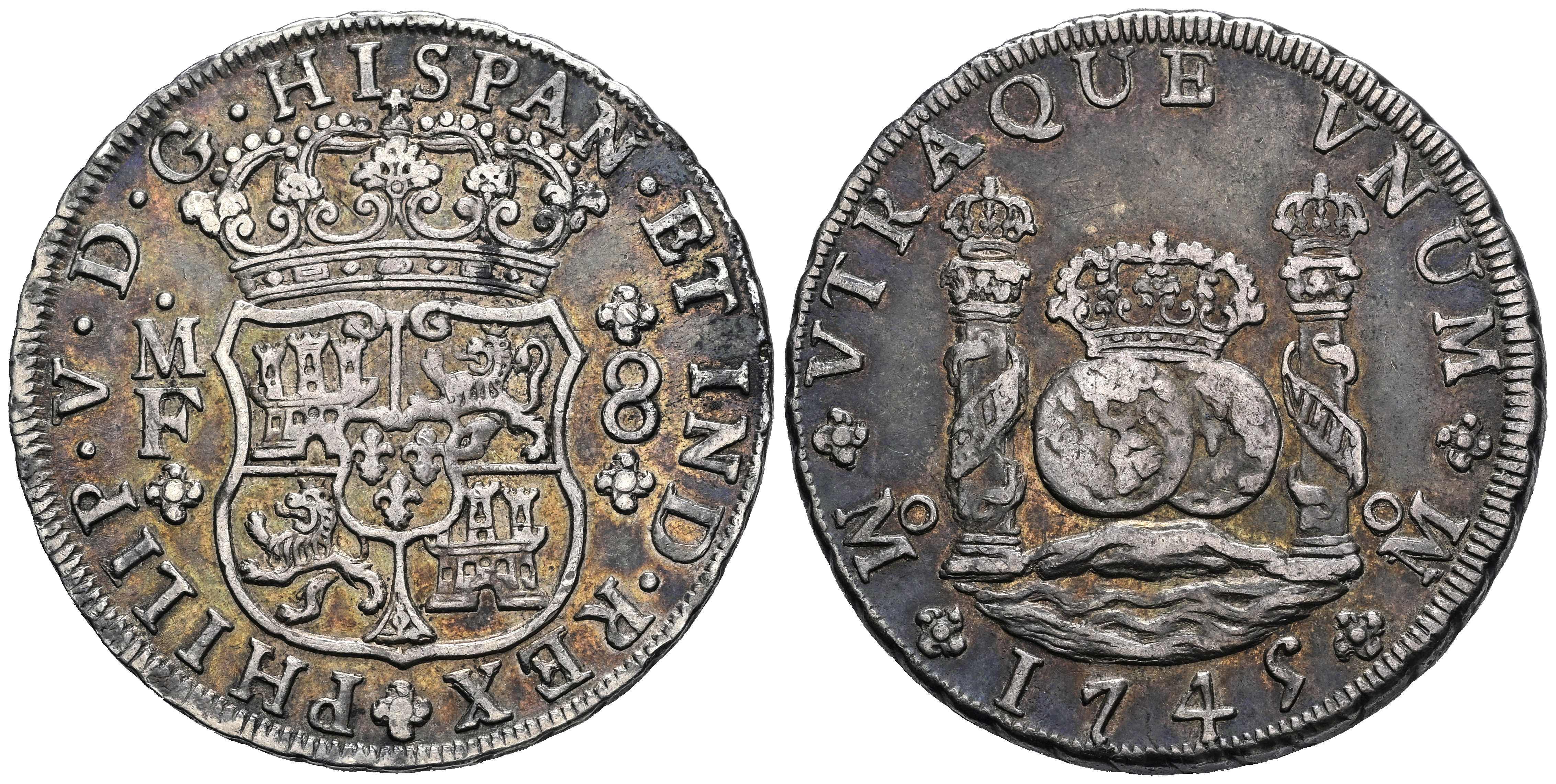 Philip V (1700-1746). 8 reales. 1745. Mexico. MF. (Cal-1468). Ag. 27,04 g. Beautiful patina. Choice VF. Est...600,00.