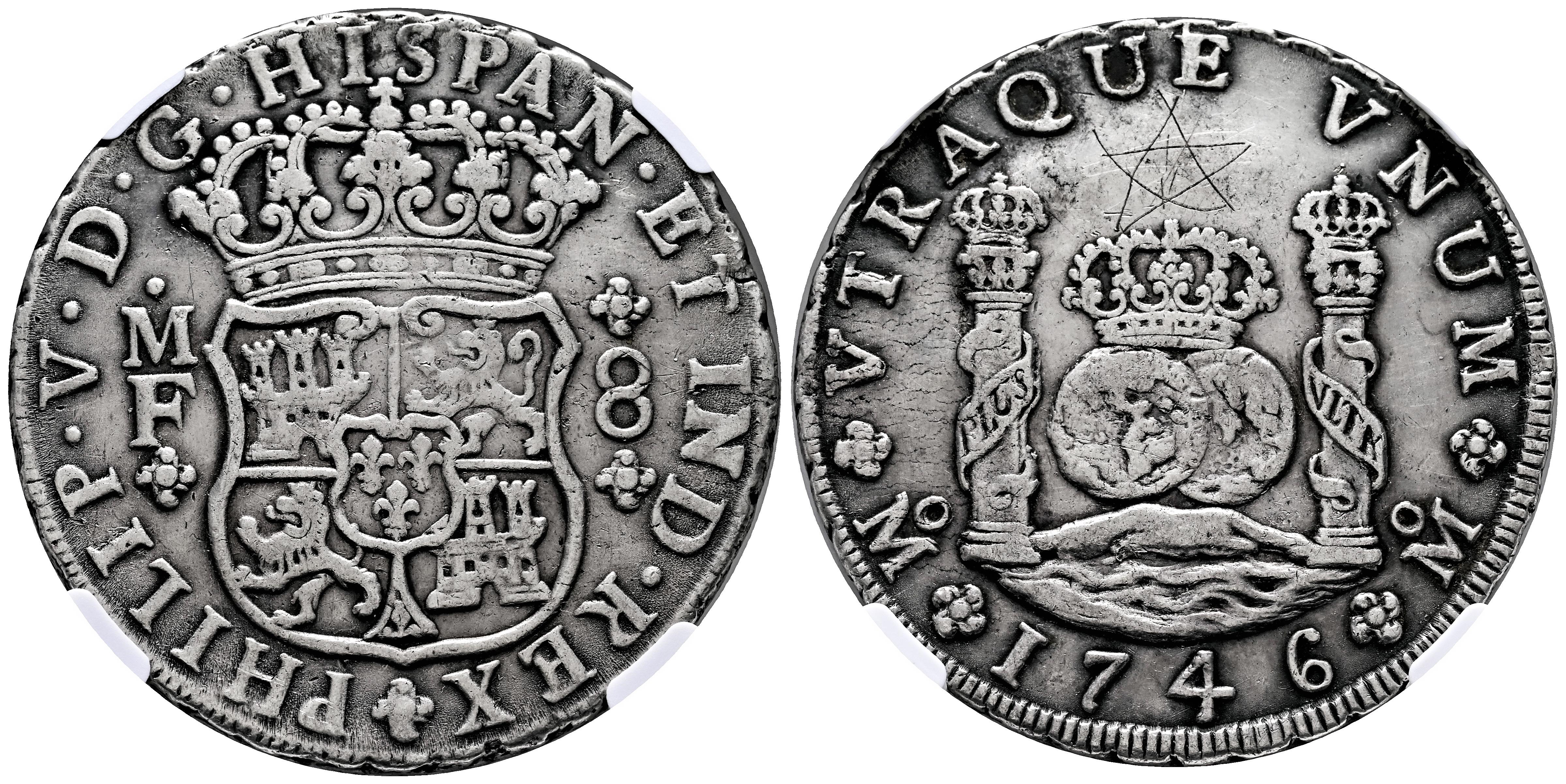 Philip V (1700-1746). 8 reales. 1746. Mexico. MF. (Cal-1470). Ag. Graffiti above the crown. Slabbed by NGC as XF Details, Graffiti. Est...400,00.