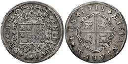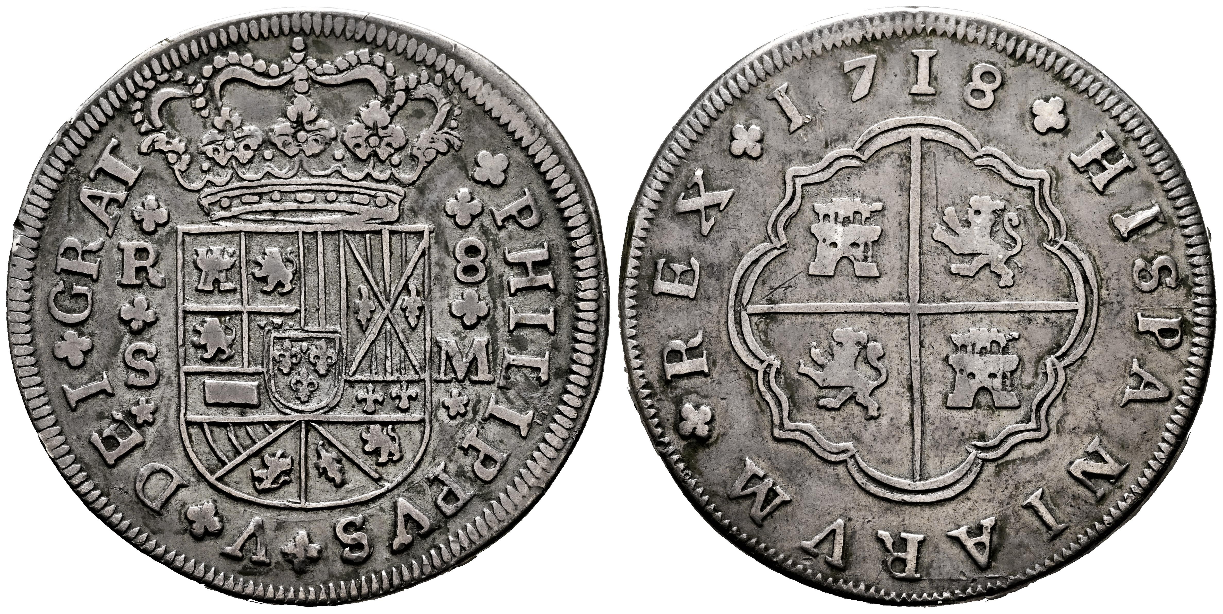 Philip V (1700-1746). 8 reales. 1718. Sevilla. M. (Cal-1617). Ag. 22,45 g. Light tone. Small edge knocks and a few minor hairlines. Scarce. Ex Numag, January 1997, lot 398. Ex José Octavio Busto Collection. Retains the collector’s label. VF/Almost VF. Est...600,00.