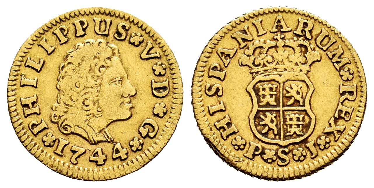 Philip V (1700-1746). 1/2 escudo. 1744. Sevilla. PJ. (Cal-1648). Au. 1,76 g. Third king´s bust. Choice VF. Est...200,00.