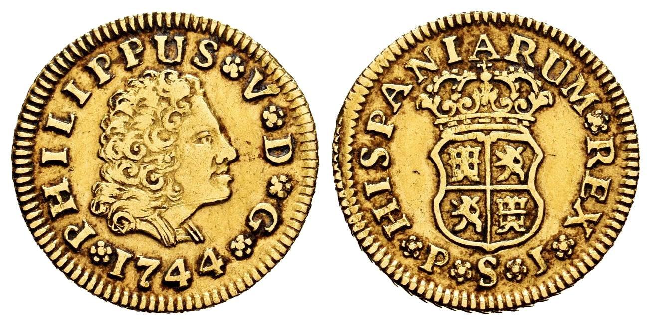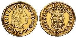 Philip V (1700-1746). 1/2 escudo. 1744. Sevilla. PJ. (Cal-1648). Au. 1,78 g. Third king´s bust. Slightly cleaned. Choice VF. Est...220,00.