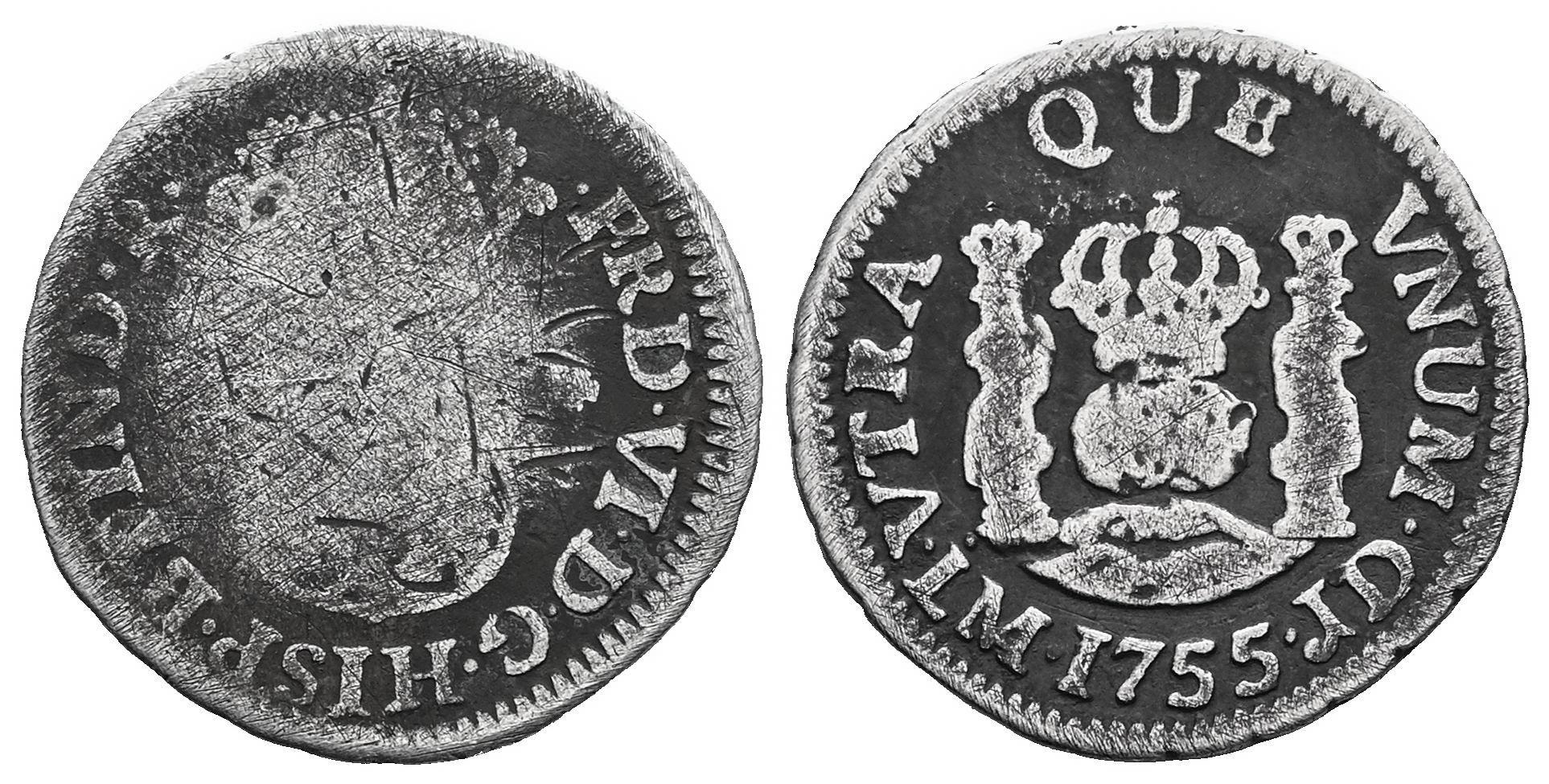 Ferdinand VI (1746-1759). 1/2 real. 1755. Lima. JD. (Cal-54). Ag. 1,43 g. Almost F/Choice F. Est...15,00.