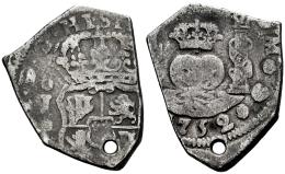 Ferdinand VI (1746-1759). 2 reales. 1752. Guatemala. J. (Cal-249). Ag. 6,52 g. Holed. Rare. VF. Est...220,00.