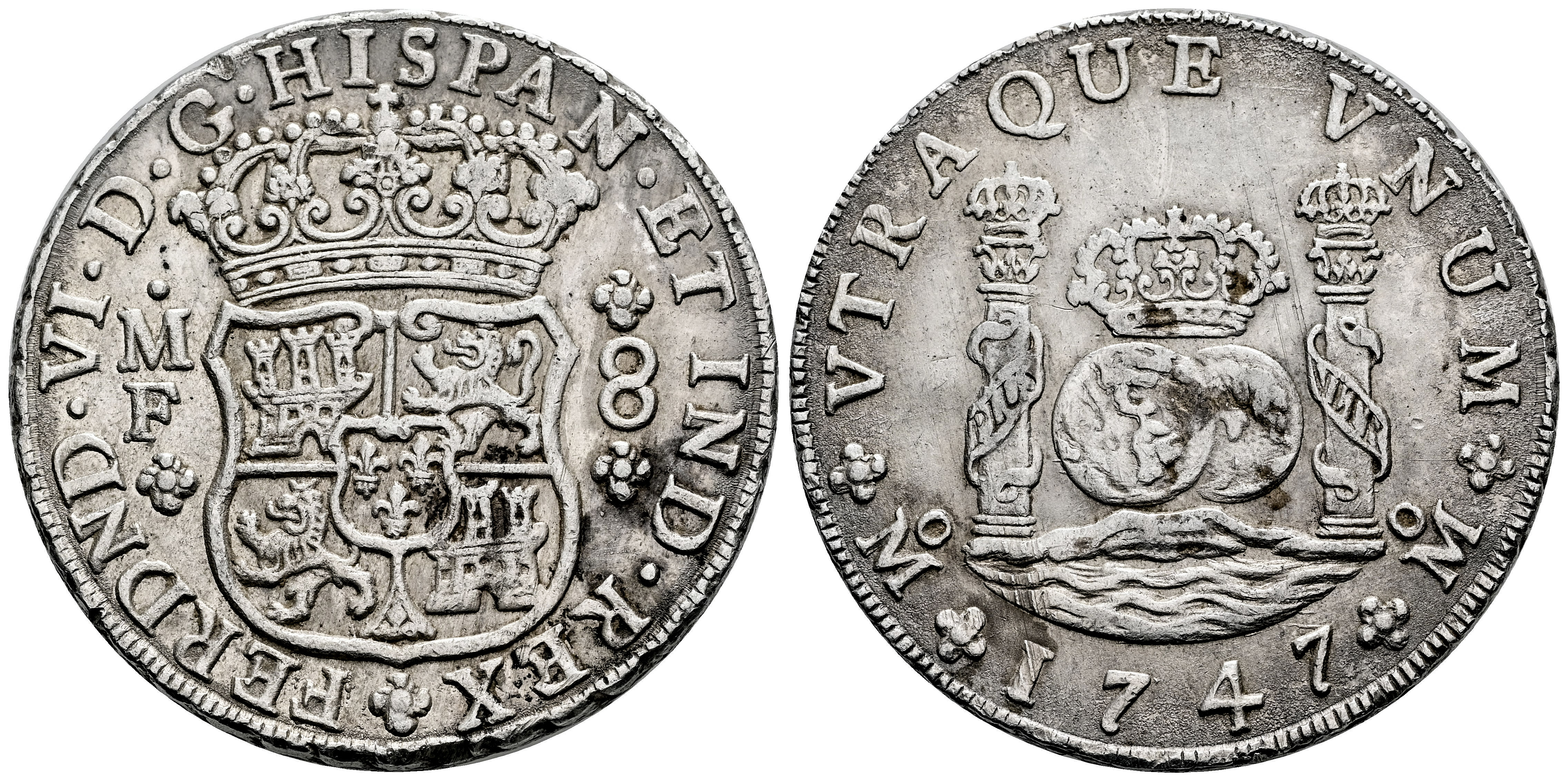Ferdinand VI (1746-1759). 8 reales. 1747. Mexico. MF. (Cal-1453). Ag. 26,87 g. Slight traces of original luster on obverse. Minimal adjustment marks on obverse. Attractive. Almost XF. Est...600,00.