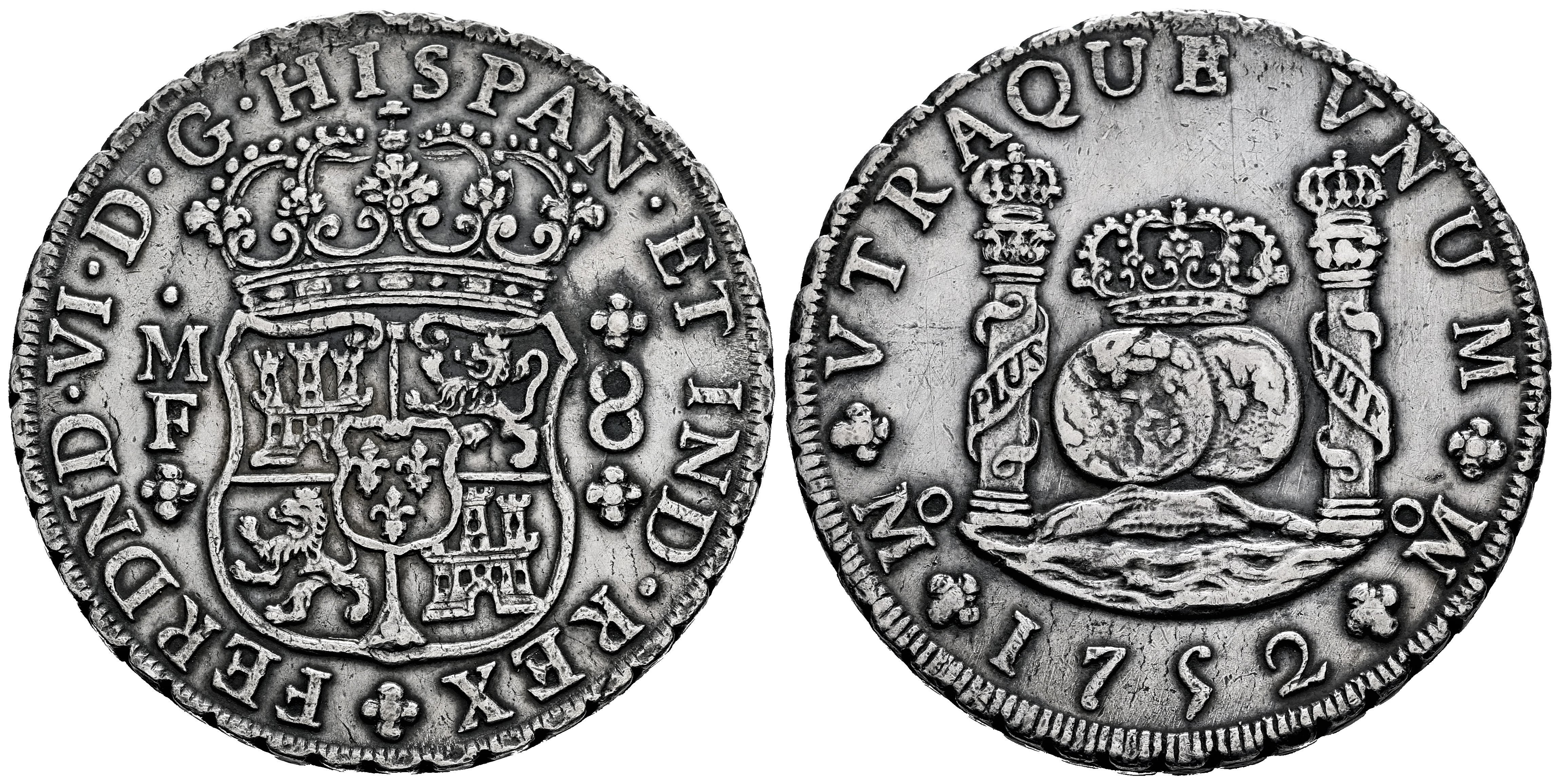 Ferdinand VI (1746-1759). 8 reales. 1752. Mexico. MF. (Cal-477). Ag. 26,89 g. Minimal hairlines. Cleaned. Lightly toned. Choice VF. Est...400,00.