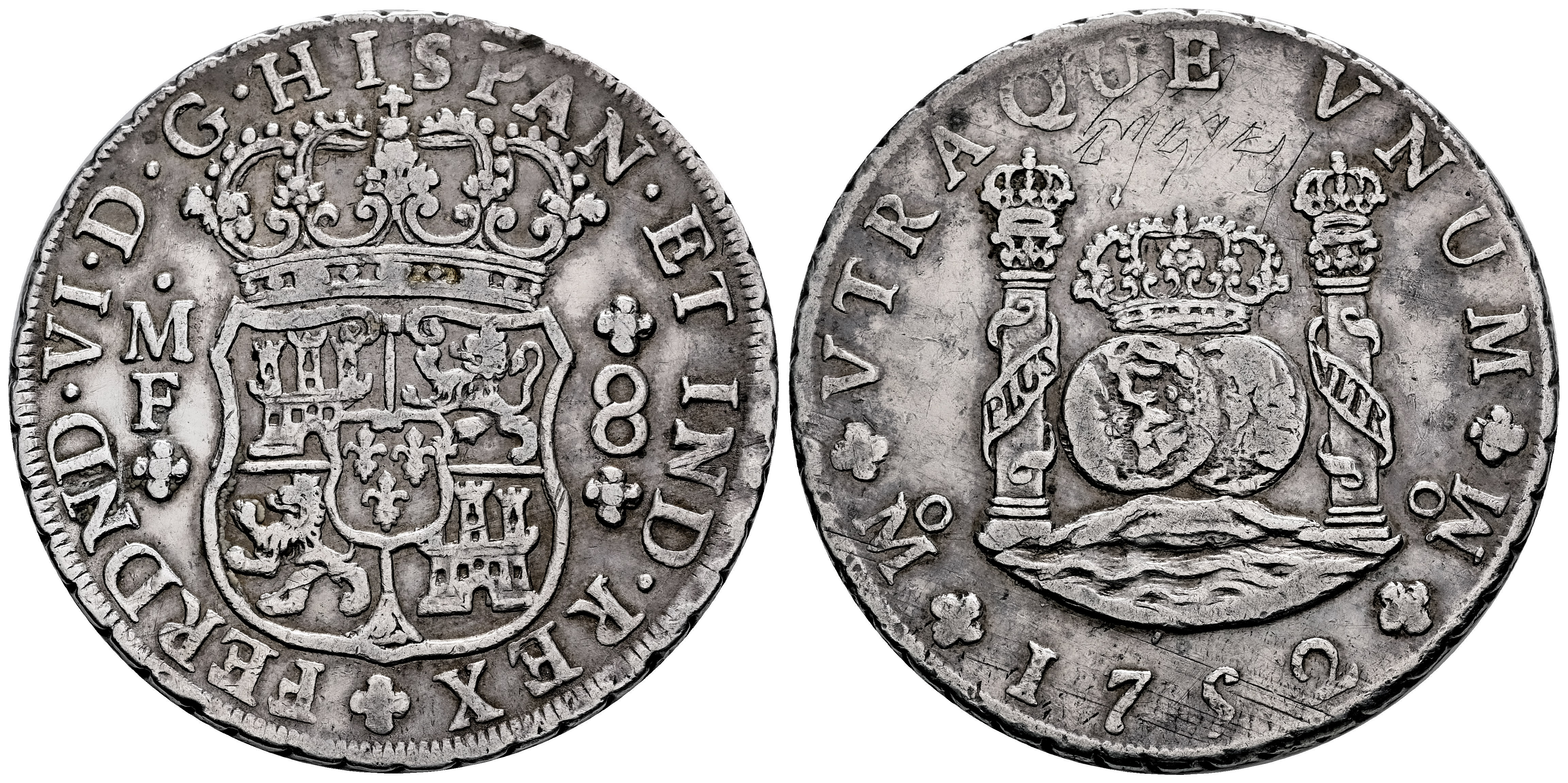 Ferdinand VI (1746-1759). 8 reales. 1752. Mexico. MF. (Cal-477). Ag. 26,88 g. Graffiti on the crown and light adjustment marks in the date area. Lightly cleaned. VF. Est...350,00.