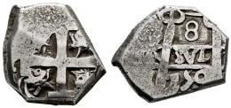 Ferdinand VI (1746-1759). 8 reales. 1750. Potosi. E. (Cal-515). Ag. 16,05 g. Clipped in the late 18th century in North Africa, the 8 reales coin was widely circulated along international trade routes. Although there is no official documentation to confirm this, it is believed that these coins were clipped to extract silver, yet they remained internationally accepted for their purity and prestige. Clipped 8 reales coins represent a numismatic enigma, possibly linked to local monetary standards in North Africa. The analysis of specimens from places like Oran and Algeria suggests that their weight was reduced in a structured manner, with a pattern showing that the weight was reduced by 55-62% of the original: the 8 reales to 15-17 grams from their original 27.1 grams, and the 4 reales to 7-8 grams from their original 13.55 grams, pointing to a possible makeshift regulation. Some theories link them to the 1773 emissions from Tripoli. This mystery remains unresolved to this day. VF. Est...300,00.