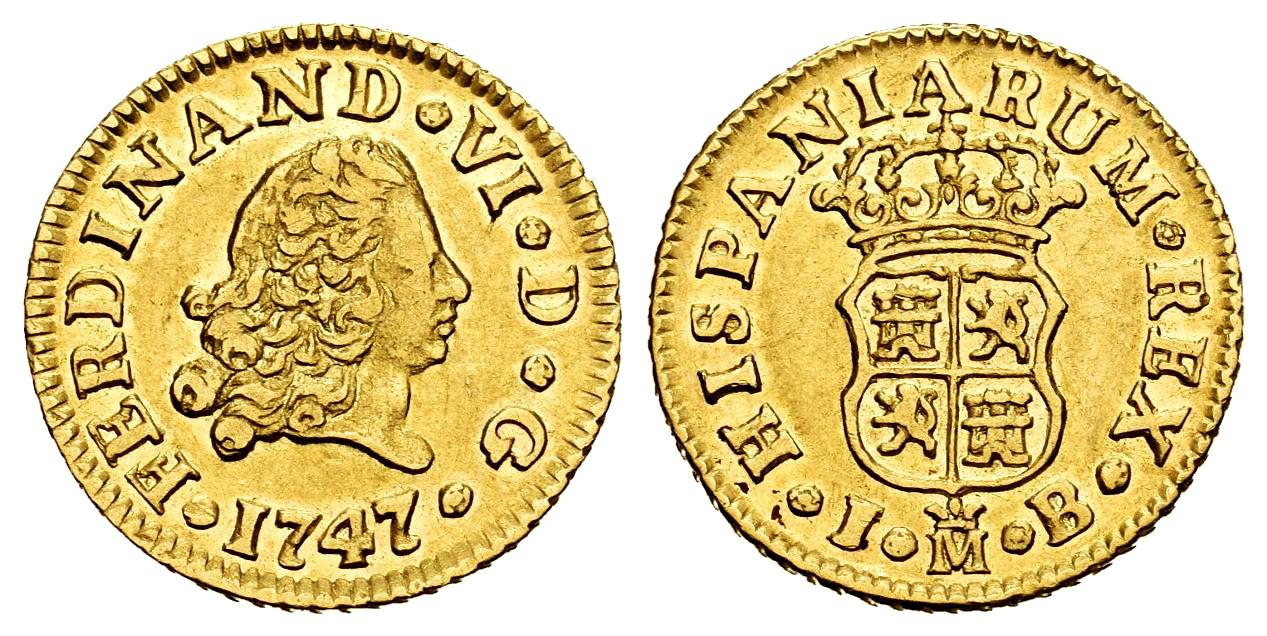 Ferdinand VI (1746-1759). 1/2 escudo. 1747. Madrid. JB. (Cal-548). Au. 1,74 g. First bust. Traces of luster. Choice VF. Est...250,00.