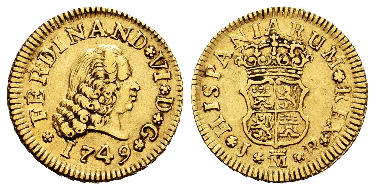 Ferdinand VI (1746-1759). 1/2 escudo. 1749. Madrid. JB. (Cal-551). Au. 1,76 g. Second bust. Choice VF. Est...250,00.