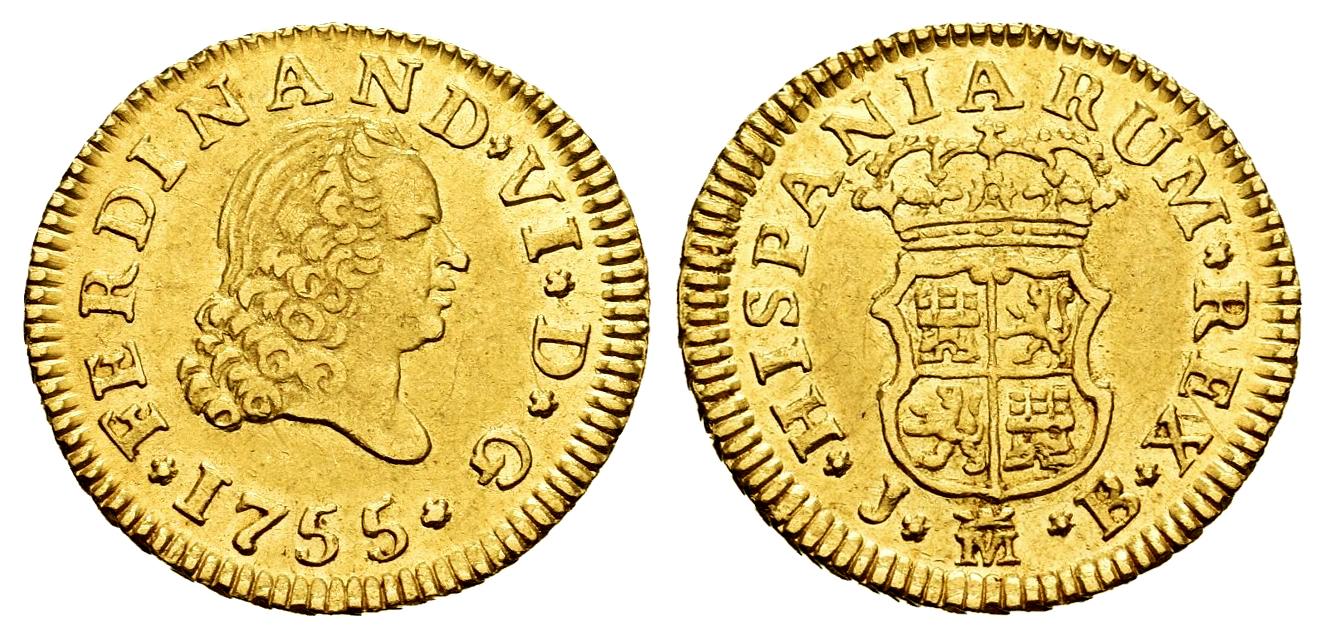 Ferdinand VI (1746-1759). 1/2 escudo. 1755. Madrid. JB. (Cal-558). Au. 1,77 g. Third king´s bust. Traces of luster. Almost XF. Est...250,00.