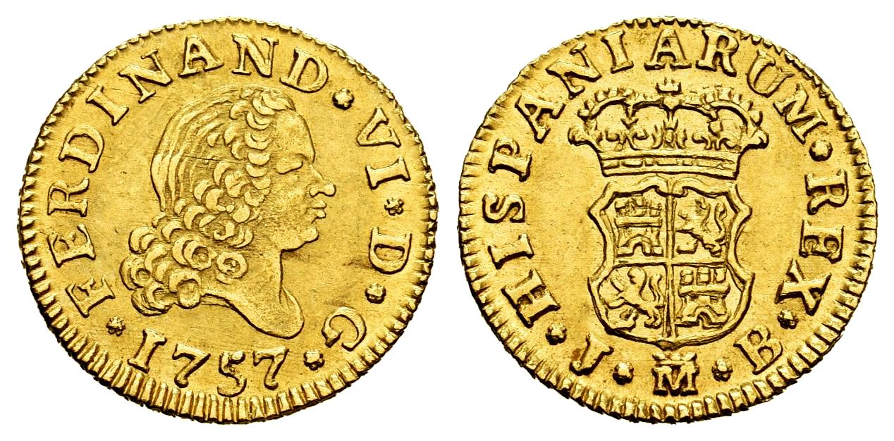 Ferdinand VI (1746-1759). 1/2 escudo. 1757. Madrid. JB. (Cal-561). Au. 1,78 g. Fourth bust. Traces of luster. Almost XF. Est...300,00.